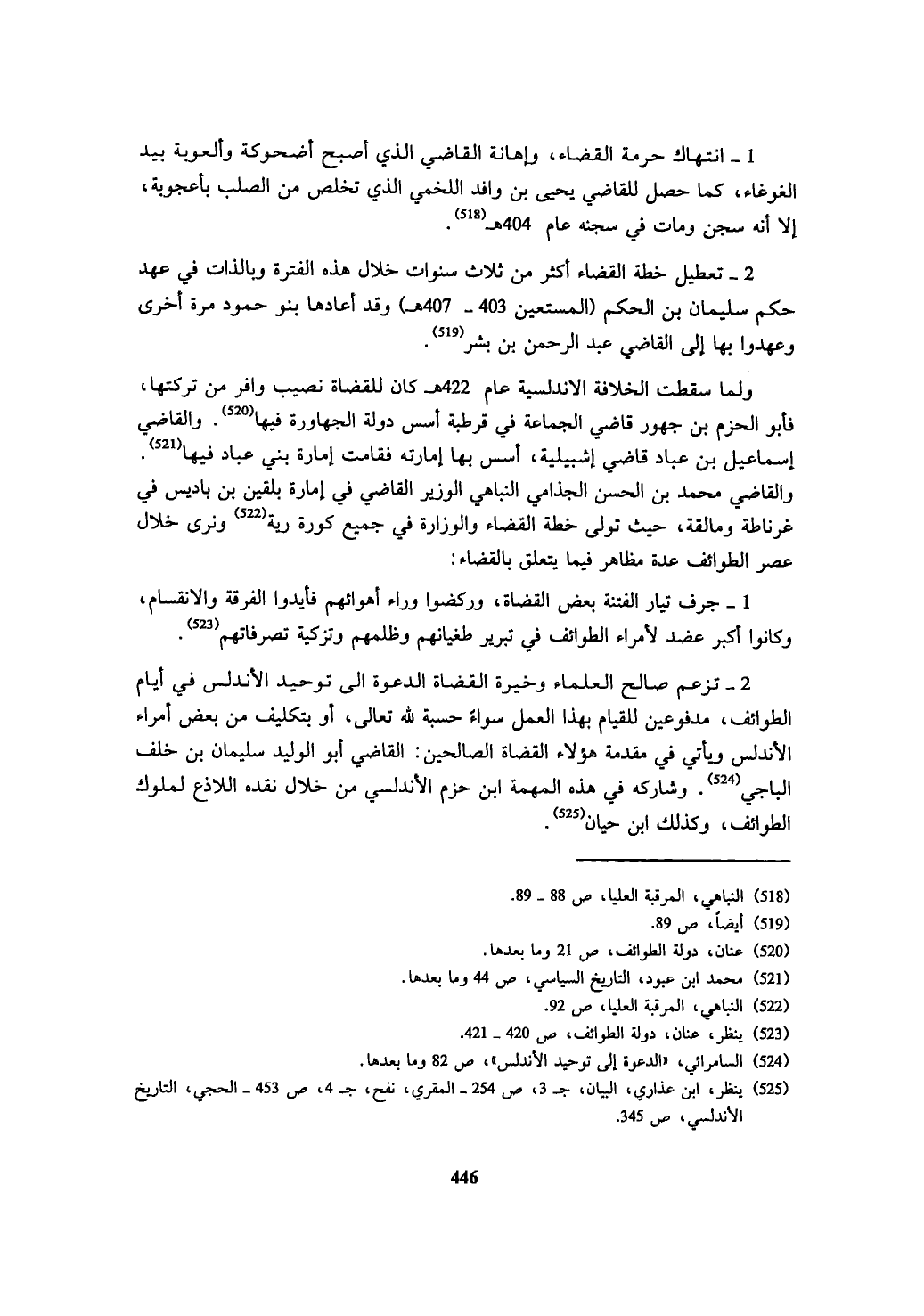 1 - جرف تيار الفتنة بعض القضاة، وركضوا وراء أهوائهم فأيدوا الفرقة والانقسام، وكانوا أكبر عضد لأمراء الطوائف في تبرير طغيانهم وظلمهم وتزكية تصرفاتهم (¬523).