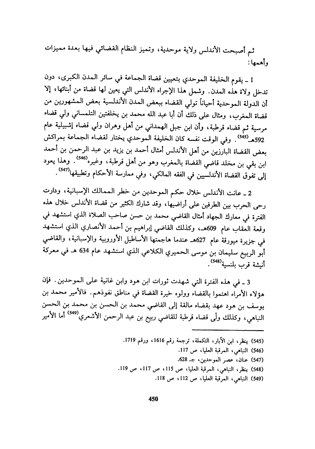 1 - يقوم الخليفة الموحدي بتعيين قضاة الجماعة في سائر المدن الكبرى، دون تدخل ولاة هذه المدن. وشمل هذا الإجراء الأندلس التي يعين لها قضاة من أبنائها، إلا أن الدولة الموحدية أحياناً تولي القضاء ببعض المدن الأندلسية بعض المشهورين من قضاة المغرب، ومثال على ذلك أن أبا عبد الله محمد بن يخلفتين التلمساني ولي قضاء مرسية ثم قضاء قرطبة، وأن ابن جبل الهمداني من أهل وهران ولي قضاء إشبيلية عام 592 هـ (¬545). وفي الوقت نفسه كان الخليفة الموحدي يختار لقضاء الجماعة بمراكش بعض القضاة البارزين من أهل الأندلس أمثال أحمد بن يزيد بن عبد الرحمن بن أحمد ابن بقي بن مخلد قاضي القضاة بالمغرب وهو من أهل قرطبة، وغيره (¬546). وهذا يعود إلى تفوق القضاة الأندلسيين في الفقه المالكي، وفي ممارسة الأحكام وتطبيقها (¬547).
