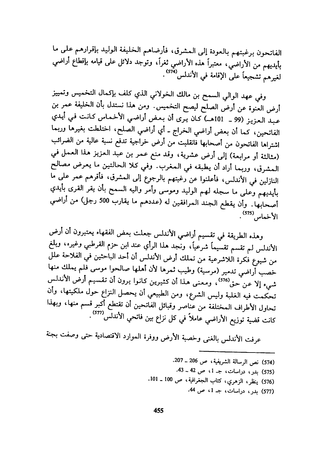 وهذه الطريقة في تقسيم أراضي الأندلس جعلت بعض الفقهاء يعتبرون أن أرض الأندلس لم تقسم تقسيماً شرعياً، ونجد هذا الرأي عند ابن حزم القرطبي وغيره، وبلغ من شيوع فكرة اللاشرعية من تملك أرض الأندلس أن أحد الباحثين في الفلاحة علل خصب أراضي تدمير (مرسية) وطيب ثمرها لأن أهلها صالحوا موسى فلم يملك منها شيء إلا عن حق (¬576)، ومعنى هذا أن كثيرين كانوا يرون أن تقسيم أرض الأندلس تحكمت فيه الغلبة وليس الشرع، ومن الطبيعي أن يحصل النزاع حول ملكيتها، وأن تحاول الأطراف المختلفة من عناصر وقبائل الفاتحين أن تقتطع أكبر قسم منها، وبهذا كانت قضية توزيع الأراضي عاملاً في كل نزاع بين فاتحي الأندلس (¬577).