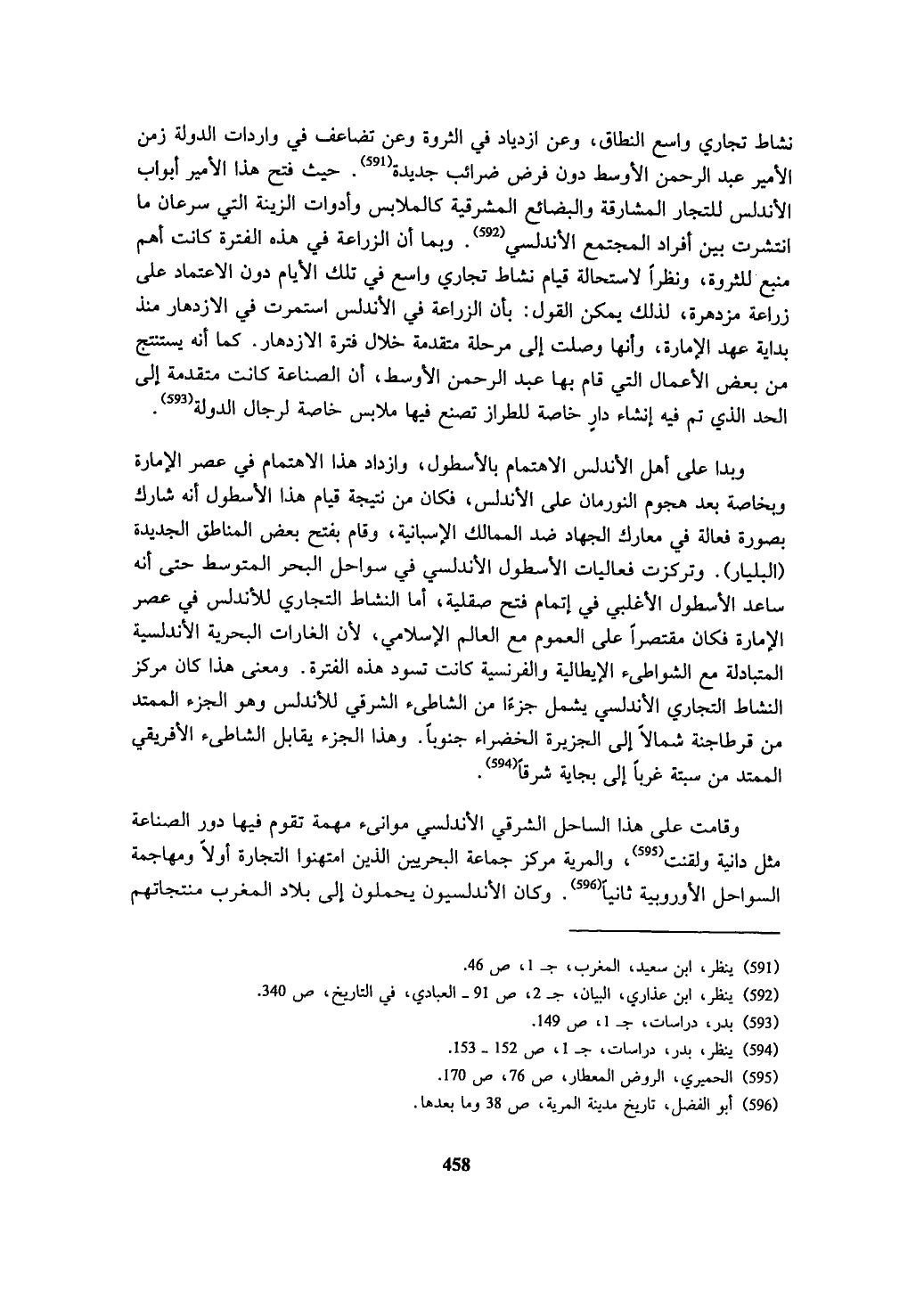 نشاط تجاري واسع النطاق، وعن ازدياد في الثروة وعن تضاعف في واردات الدولة زمن الأمير عبد الرحمن الأوسط دون فرض ضرائب جديدة (¬591). حيث فتح هذا الأمير أبواب الأندلس للتجار المشارقة والبضائع المشرقية كالملابس وأدوات الزينة التي سرعان ما انتشرت بين أفراد المجتمع الأندلسي (¬592). وبما أن الزراعة في هذه الفترة كانت أهم منبع للثروة، ونظراً لاستحالة قيام نشاط تجاري واسع في تلك الأيام دون الاعتماد على زراعة مزدهرة، لذلك يمكن القول: بأن الزراعة في الأندلس استمرت في الازدهار منذ بداية عهد الإمارة، وأنها وصلت إلى مرحلة متقدمة خلال فترة الازدهار. كما أنه يستنتج من بعض الأعمال التي قام بها عبد الرحمن الأوسط، أن الصناعة كانت متقدمة إلى الحد الذي تم فيه إنشاء دارٍ خاصة للطراز تصنع فيها ملابس خاصة لرجال الدولة (¬593).