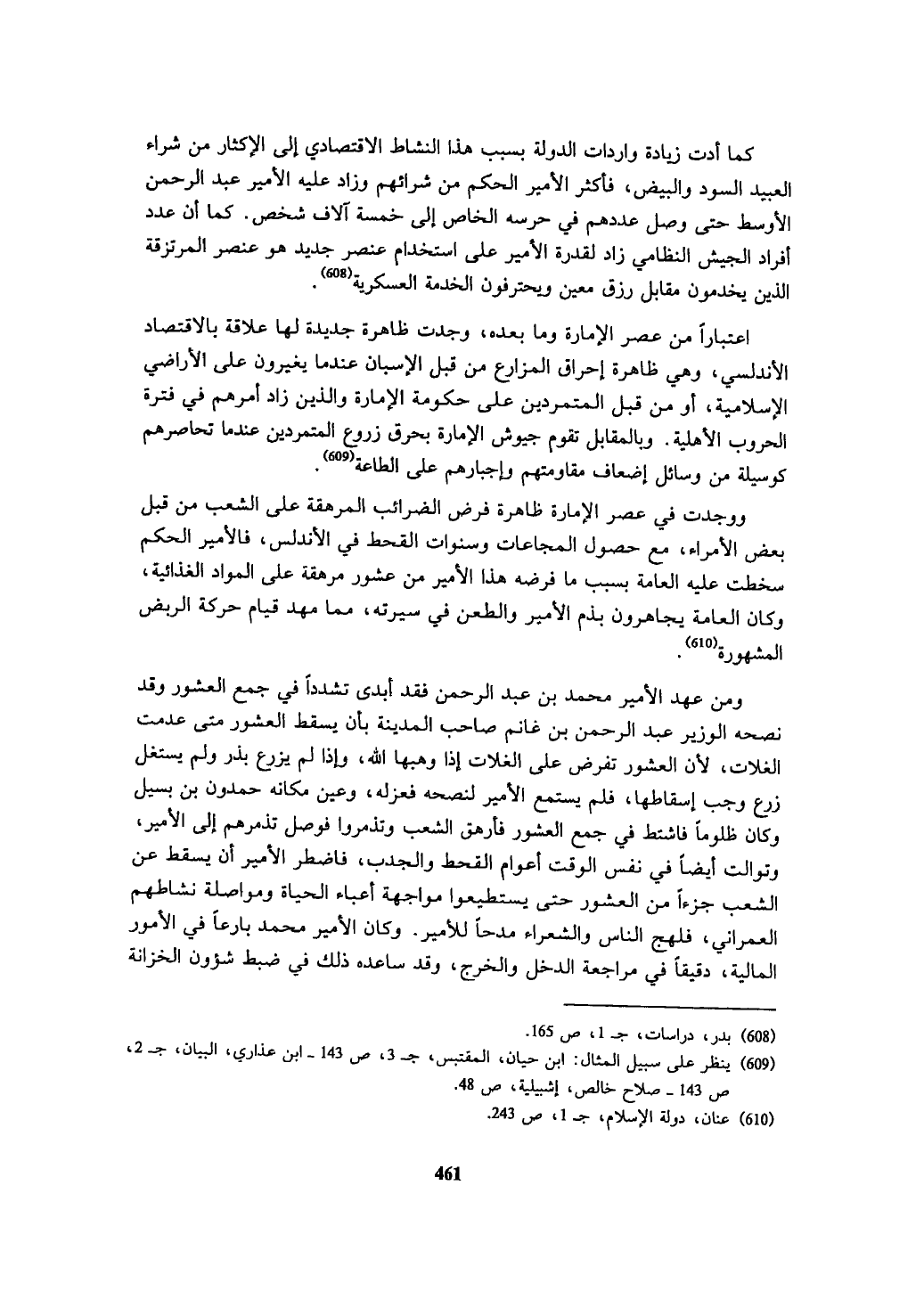 ووجدت في عصر الإمارة ظاهرة فرض الضرائب المرهقة على الشعب من قبل بعض الأمراء، مع حصول المجاعات وسنوات القحط في الأندلس، فالأمير الحكم سخطت عليه العامة بسبب ما فرضه هذا الأمير من عشور مرهقة على المواد الغذائية، وكان العامة يجاهرون بذم الأمير والطعن في سيرته، مما مهد قيام حركة الربض المشهورة (¬610).