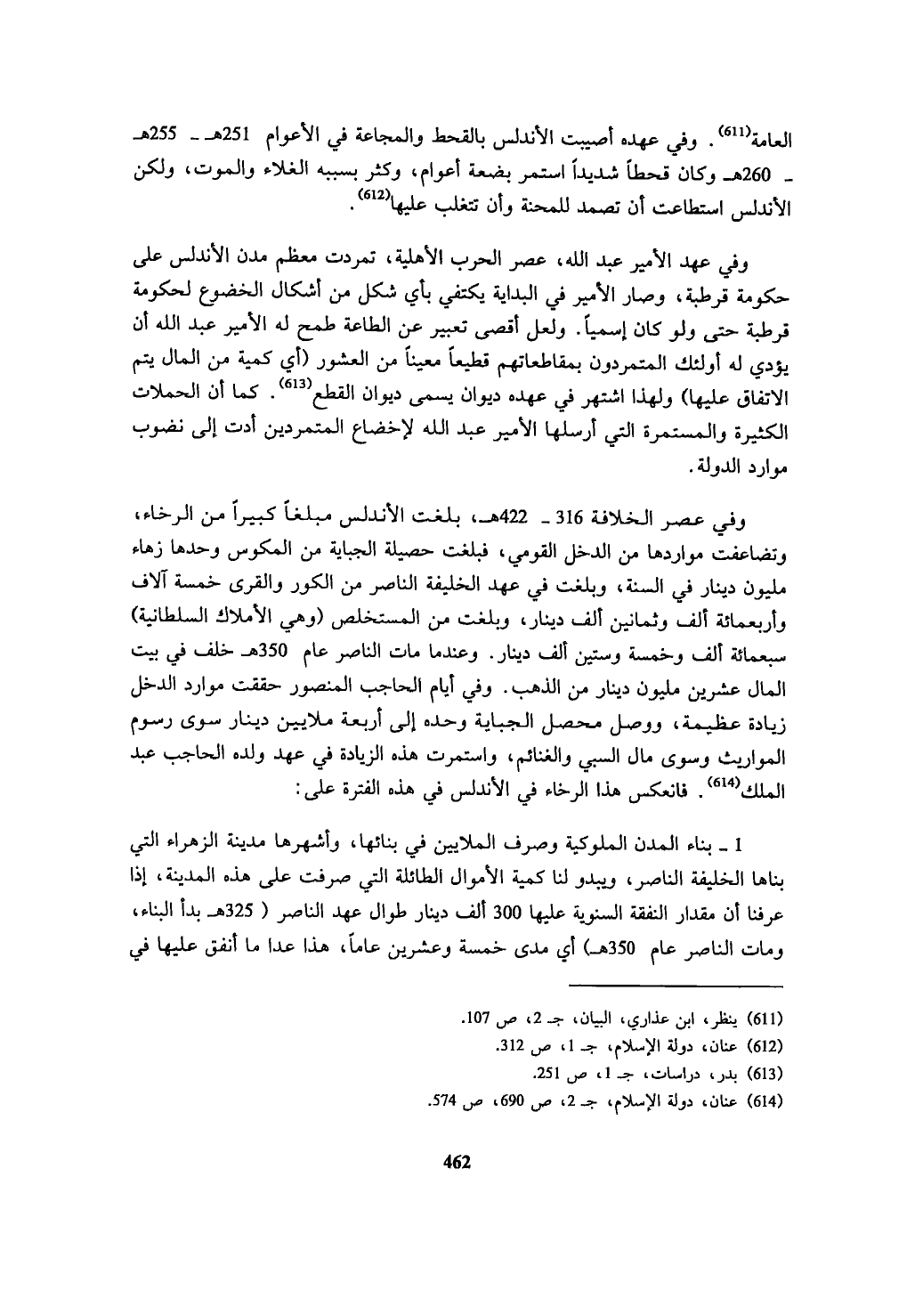 العامة (¬611). وفي عهده أصيبت الأندلس بالقحط والمجاعة في الأعوام 251 هـ - 255 هـ - 260 هـ وكان قحطاً شديداً استمر بضعة أعوام، وكثر بسببه الغلاء والموت، ولكن الأندلس استطاعت أن تصمد للمحنة وأن تتغلب عليها (¬612).
