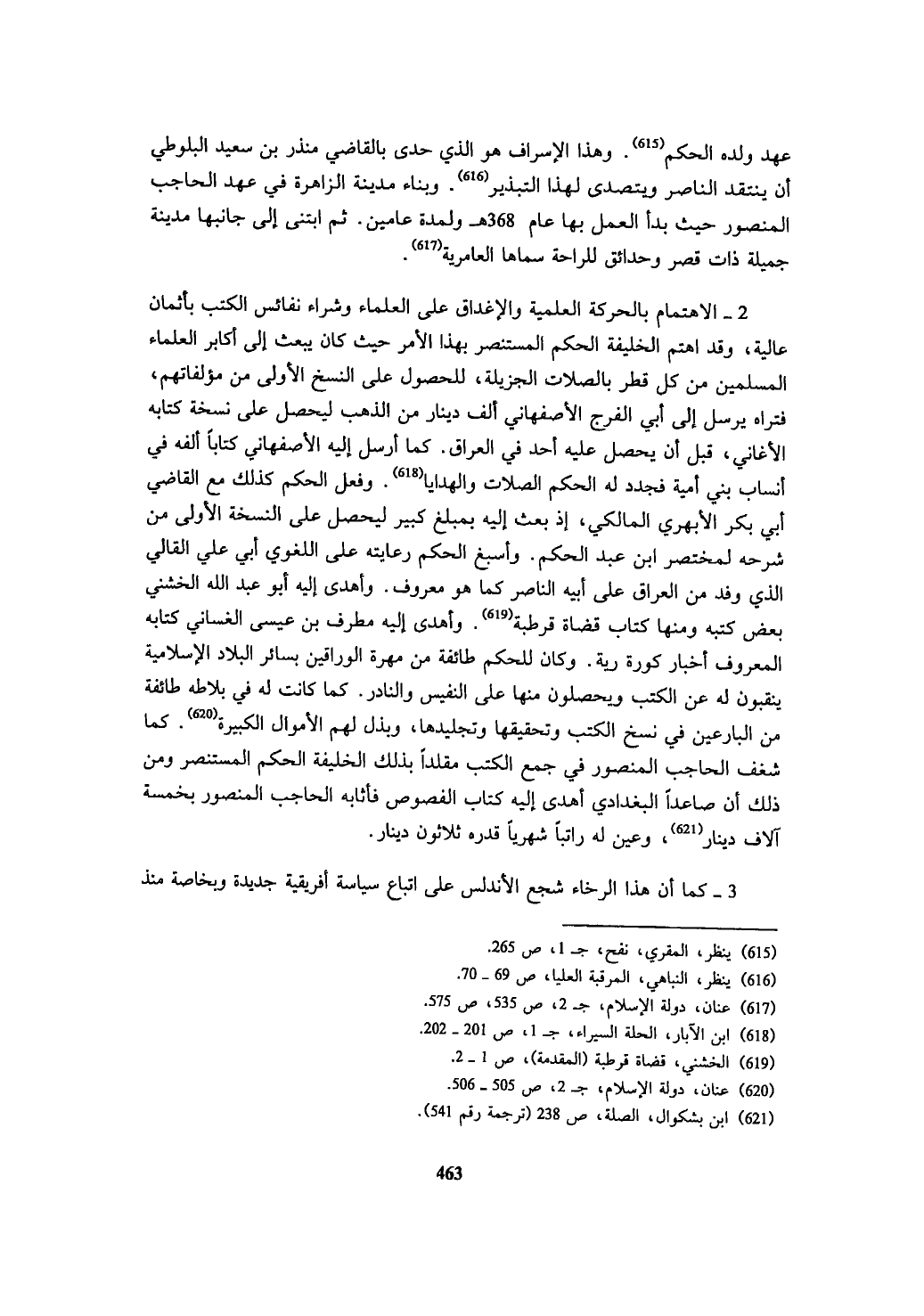 2 - الاهتمام بالحركة العلمية والإغداق على العلماء وشراء نفائس الكتب بأثمان عالية، وقد اهتم الخليفة الحكم المستنصر بهذا الأمر حيث كان يبعث إلى أكابر العلماء المسلمين من كل قطر بالصلات الجزيلة، للحصول على النسخ الأولى من مؤلفاتهم، فتراه يرسل إلى أبي الفرج الأصفهاني ألف دينار من الذهب ليحصل على نسخة كتابه الأغاني، قبل أن يحصل عليه أحد في العراق. كما أرسل إليه الأصفهاني كتاباً ألفه في أنساب بني أمية فجدد له الحكم الصلات والهدايا (¬618). وفعل الحكم كذلك مع القاضي أبي بكر الأبهري المالكي، إذ بعث إليه بمبلغ كبير ليحصل على النسخة الأولى من شرحه لمختصر ابن عبد الحكم. وأسبغ الحكم رعايته على اللغوي أبي علي القالي الذي وفد من العراق على أبيه الناصر كما هو معروف. وأهدى إليه أبو عبد الله الخشني بعض كتبه ومنها كتاب قضاة قرطبة (¬619). وأهدى إليه مطرف بن عيسى الغساني كتابه المعروف أخبار كورة رية. وكان للحكم طائفة من مهرة الوراقين بسائر البلاد الإسلامية ينقبون له عن الكتب ويحصلون منها على النفيس والنادر. كما كانت له في بلاطه طائفة من البارعين في نسخ الكتب وتحقيقها وتجليدها، وبذل لهم الأموال الكبيرة (¬620). كما شغف الحاجب المنصور في جمع الكتب مقلداً بذلك الخليفة الحكم المستنصر ومن ذلك أن صاعداً البغدادي أهدى إليه كتاب الفصوص فأثابه الحاجب المنصور بخمسة آلاف دينار (¬621)، وعين له راتباً شهرياً قدره ثلاثون دينار.