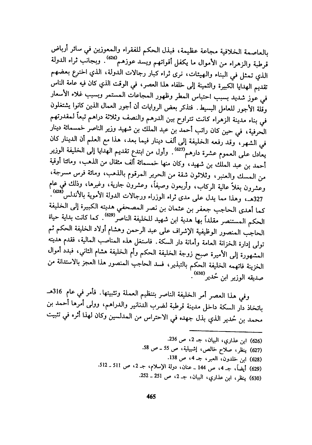 بالعاصمة الخلافية مجاعة عظيمة، فبذل الحكم للفقراء والمعوزين في سائر أرباض قرطبة والزهراء من الأموال ما يكفل أقواتهم ويسد عوزهم (¬626). وبجانب ثراء الدولة الذي تمثل في البناء والهيئات، نرى ثراء كبار رجالات الدولة، الذي اخترع بعضهم تقديم الهدايا الكبيرة والثمينة إلى خلفاء هذا العصر، في الوقت الذي كان فيه عامة الناس في عوز شديد بسبب احتباس المطر وظهور المجاعات المستمر وبسبب غلاء الأسعار وقلة الأجور للعامل البسيط. فتذكر بعض الروايات أن أجور العمال الذين كانوا يشتغلون في بناء مدينة الزهراء كانت تتراوح بين الدرهم والنصف وثلاثة دراهم تبعاً لمقدرتهم الحرفية، في حين كان راتب أحمد بن عبد الملك بن شهيد وزير الناصر خمسمائة دينار في الشهر، وقد رفعه الخليفة إلى ألف دينار فيما بعد، هذا مع العلم أن الدينار كان يعادل على العموم عشرة دراهم (¬627). وأول من ابتدع تقديم الهدايا إلى الخليفة الوزير أحمد بن عبد الملك بن شهيد، وكان منها خمسمائة ألف مثقال من الذهب، ومائتا أوقية من المسك والعنبر، وثلاثون شقة من الحرير المرقوم بالذهب، ومائة فرس مسرجة، وعشرون بغلاً عالية الركاب، وأربعون وصيفاً، وعشرون جارية، وغيرها، وذلك في عام 327 هـ، وهذا مما يدل على مدى ثراء الوزراء ورجالات الدولة الأموية بالأندلس (¬628).