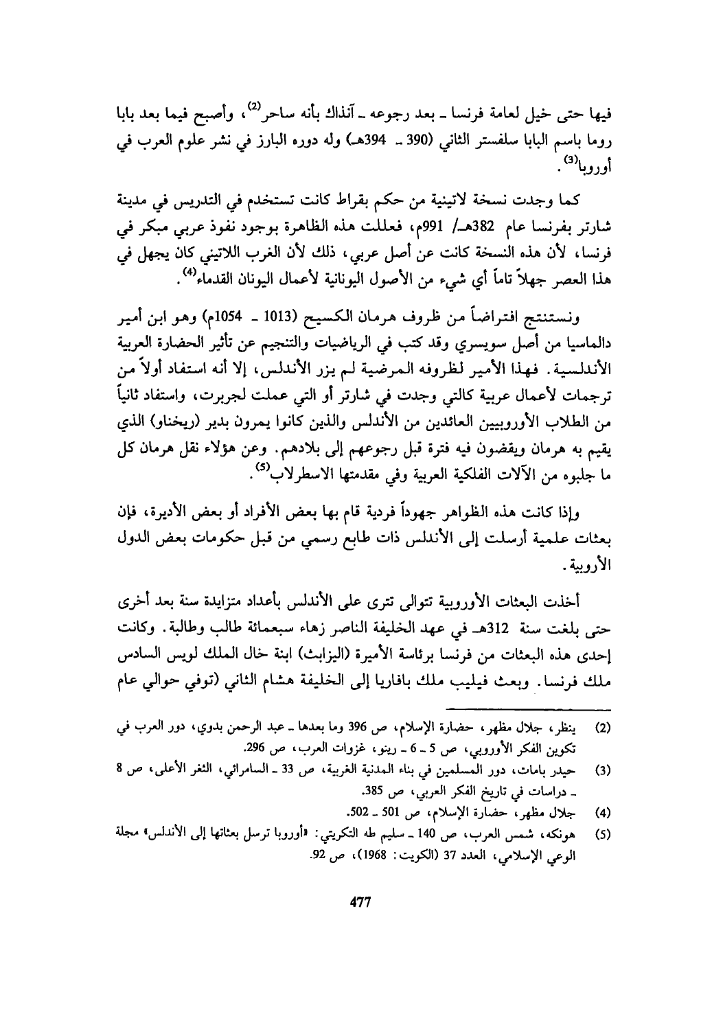 (¬2) ينظر، جلال مظهر، حضارة الإسلام، ص 396 وما بعدها - عبد الرحمن بدوي، دور العرب في تكوين الفكر الأوروبي، ص 5 - 6 - رينو، غزوات العرب، ص 296.