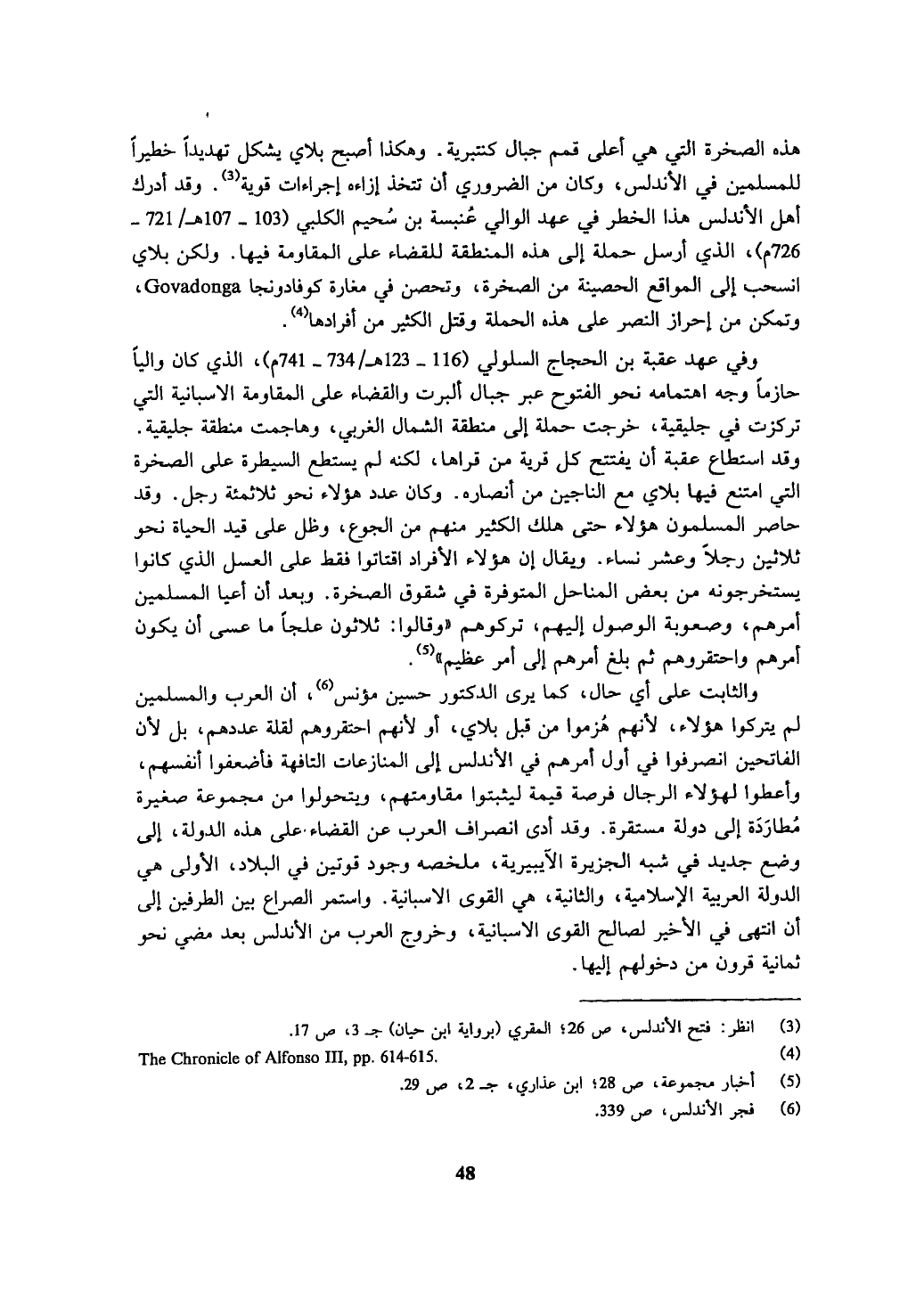 والثابت على أي حال، كما يرى الدكتور حسين مؤنس (¬6)، أن العرب والمسلمين لم يتركوا هؤلاء، لأنهم هُزموا من قبل بلاي، أو لأنهم احتقروهم لقلة عددهم، بل لأن الفاتحين انصرفوا في أول أمرهم في الأندلس إلى المنازعات التافهة فأضعفوا أنفسهم، وأعطوا لهؤلاء الرجال فرصة قيمة ليثبتوا مقاومتهم، ويتحولوا من مجموعة صغيرة مُطارَدَة إلى دولة مستقرة. وقد أدى انصراف العرب عن القضاء على هذه الدولة، إلى وضع جديد في شبه الجزيرة الآيبيرية، ملخصه وجود قوتين في البلاد، الأولى هي الدولة العربية الإسلامية، والثانية، هي القوى الاسبانية. واستمر الصراع بين الطرفين إلى أن انتهى في الأخير لصالح القوى الاسبانية، وخروج العرب من الأندلس بعد مضي نحو ثمانية قرون من دخولهم إليها.