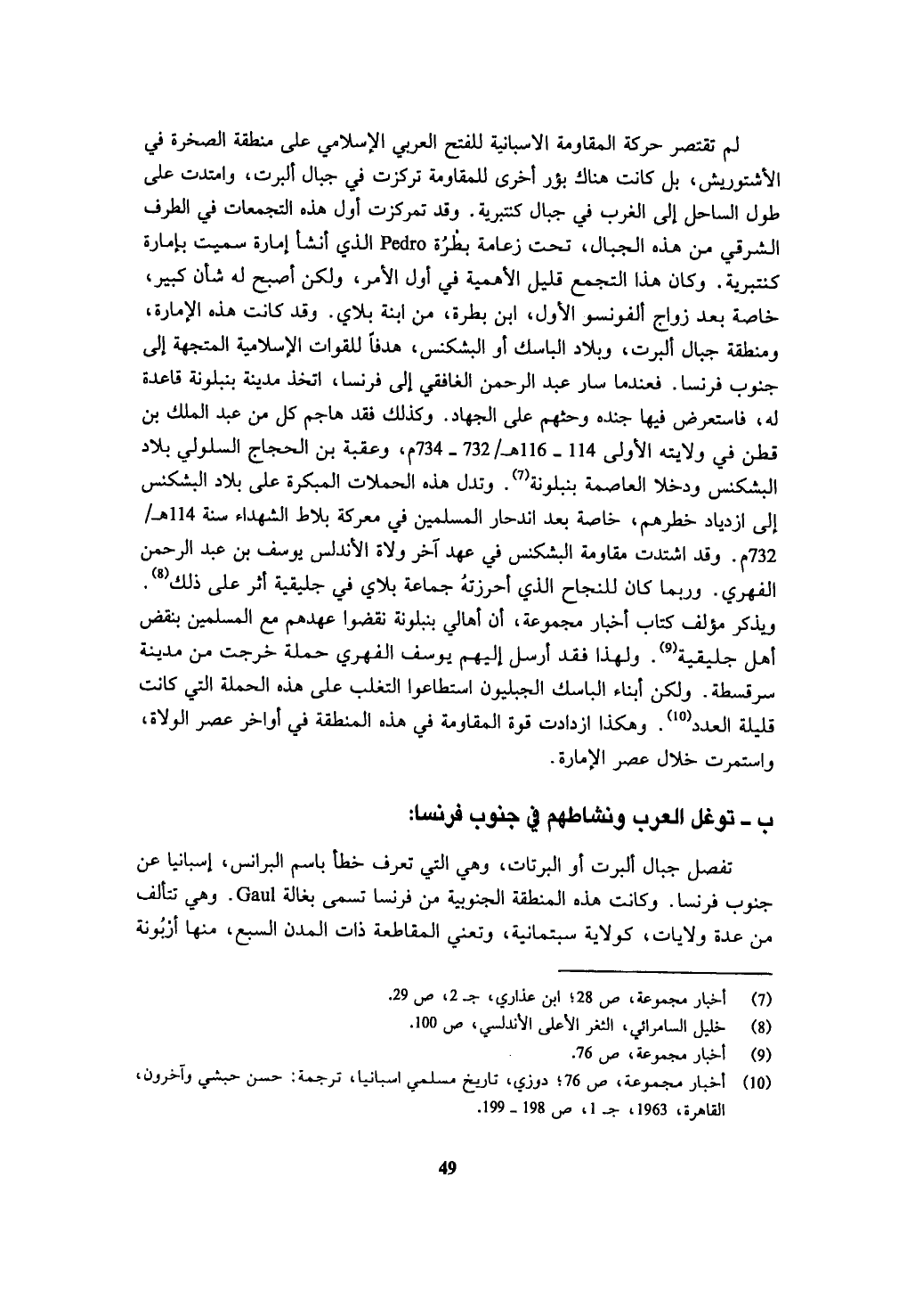 ويذكر مؤلف كتاب أخبار مجموعة، أن أهالي بنبلونة نقضوا عهدهم مع المسلمين بنقض أهل جليقية (¬9). ولهذا فقد أرسل إليهم يوسف الفهري حملة خرجت من مدينة سرقسطة. ولكن أبناء الباسك الجبليون استطاعوا التغلب على هذه الحملة التي كانت قليلة العدد (¬10). وهكذا ازدادت قوة المقاومة في هذه المنطقة في أواخر عصر الولاة، واستمرت خلال عصر الإمارة.
