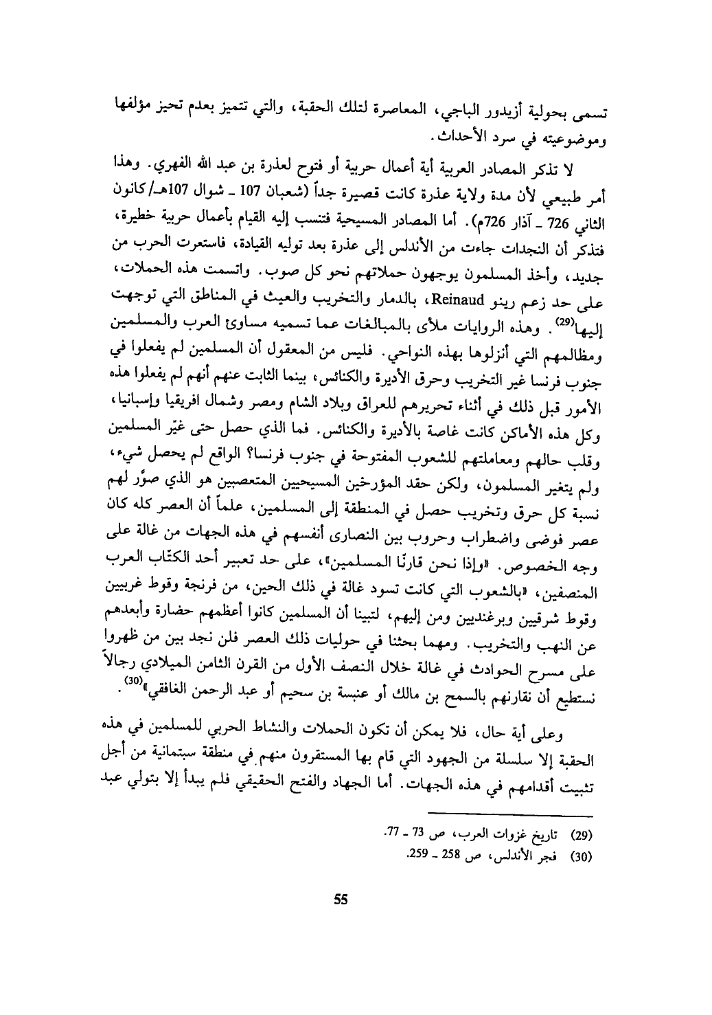 لا تذكر المصادر العربية أية أعمال حربية أو فتوح لعذرة بن عبد الله الفهري. وهذا أمر طبيعي لأن مدة ولاية عذرة كانت قصيرة جداً (شعبان 107 - شوال 107 هـ/ كانون الثاني 726 - آذار 726 م). أما المصادر المسيحية فتنسب إليه القيام بأعمال حربية خطيرة، فتذكر أن النجدات جاءت من الأندلس إلى عذرة بعد توليه القيادة، فاستعرت الحرب من جديد، وأخذ المسلمون يوجهون حملاتهم نحو كل صوب. واتسمت هذه الحملات، على حد زعم رينو Reinaud، بالدمار والتخريب والعيث في المناطق التي توجهت إليها (¬29). وهذه الروايات ملأى بالمبالغات عما تسميه مساوئ العرب والمسلمين ومظالمهم التي أنزلوها بهذه النواحي. فليس من المعقول أن المسلمين لم يفعلوا في جنوب فرنسا غير التخريب وحرق الأديرة والكنائس، بينما الثابت عنهم أنهم لم يفعلوا هذه الأمور قبل ذلك في أثناء تحريرهم للعراق وبلاد الشام ومصر وشمال أفريقيا وإسبانيا، وكل هذه الأماكن كانت غاصة بالأديرة والكنائس. فما الذي حصل حتى غيّر المسلمين وقلب حالهم ومعاملتهم للشعوب المفتوحة في جنوب فرنسا؟ الواقع لم يحصل شيء، ولم يتغير المسلمون، ولكن حقد المؤرخين المسيحيين المتعصبين هو الذي صوّر لهم نسبة كل حرق وتخريب حصل في المنطقة إلى المسلمين، علماً أن العصر كله كان عصر فوضى واضطراب وحروب بين النصارى أنفسهم في هذه الجهات من غالة على وجه الخصوص. " وإذا نحن قارنّا المسلمين "، على حد تعبير أحد الكتّاب العرب المنصفين، " بالشعوب التي كانت تسود غالة في ذلك الحين، من فرنجة وقوط غربيين وقوط شرقيين وبرغنديين ومن إليهم، لتبينا أن المسلمين كانوا أعظمهم حضارة وأبعدهم عن النهب والتخريب. ومهما بحثنا في حوليات ذلك العصر فلن نجد بين من ظهروا على مسرح الحوادث في غالة خلال النصف الأول من القرن الثامن الميلادي رجالاً نستطيع أن نقارنهم بالسمح بن مالك أو عنبسة بن سحيم أو عبد الرحمن الغافقي " (¬30).
