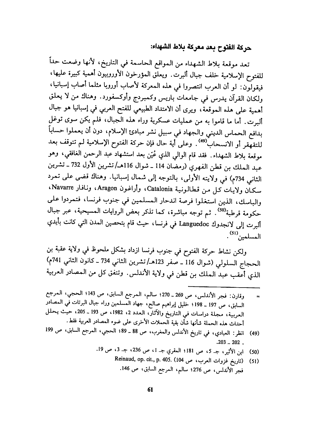 = وقارن: فجر الأندلس، ص 269 - 270؛ سالم، المرجع السابق، ص 143؛ الحجي، المرجع السابق، ص 197 - 198؛ خليل إبراهيم صالح، جهاد المسلمين وراء جبال البرتات في المصادر العربية، مجلة دراسات في التاريخ والآثار، العدد 2، 1982، ص 193 - 205، حيث يحلل أحداث هذه الحملة شأنها شأن بقية الحملات الأخرى على ضوء المصادر العربية فقط.