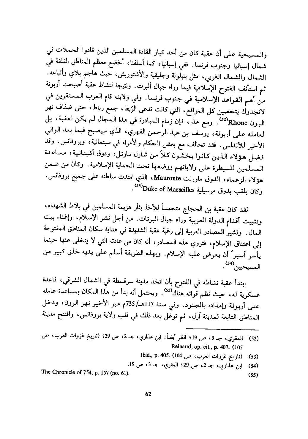 والمسيحية على أن عقبة كان من أحد كبار القادة المسلمين الذين قادوا الحملات في شمال إسبانيا وجنوب فرنسا. ففي إسبانيا، كما أسلفنا، أخضع معظم المناطق القلقة في الشمال والشمال الغربي، مثل بنبلونة وجليقية والأشتوريش، حيث هاجم بلاي وأتباعه. ثم استأنف الفتوح الإسلامية فيما وراء جبال ألبرت. ونتيجة لنشاط عقبة أصبحت أربونة من أهم القواعد الإسلامية في جنوب فرنسا. وفي ولايته قام العرب المستقرين في لانجدوك بتحصين كل المواقع، التي كانت تدعى الرُبط، جمع رباط، حتى ضفاف نهر الرون Rhone (¬52) . ومع هذا، فإن زمام المبادرة في هذا المجال لم يكن لعقبة، بل لعامله على أربونة، يوسف بن عبد الرحمن الفهري، الذي سيصبح فيما بعد الوالي الأخير للأندلس. فقد تحالف مع بعض الحكام والأمراء في سبتمانية، وبروفانس. وقد فضل هؤلاء الذين كانوا يخشون كلاّ من شارل مارتل، ودوق أكيتانية، مساعدة المسلمين للسيطرة على ولاياتهم ووضعها تحت الحماية الإسلامية. وكان من ضمن هؤلاء الزعماء، الدوق ماورنت Mauronte، الذي امتدت سلطته على جميع بروفانس، وكان يلقب بدوق مرسيلية Duke of Marseilles (¬53) .