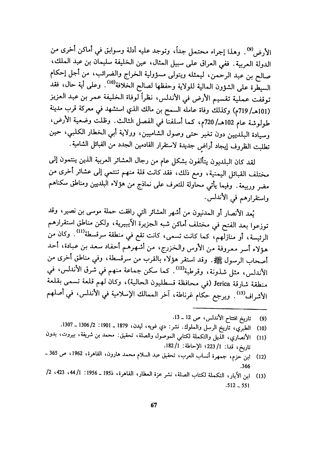الأرض (¬9). وهذا إجراء محتمل جداً، وتوجد عليه أدلة وسوابق في أماكن أخرى من الدولة العربية. ففي العراق على سبيل المثال، عين الخليفة سليمان بن عبد الملك، صالح بن عبد الرحمن، ليمثله ويتولى مسؤولية الخراج والضرائب، من أجل إحكام السيطرة على الشؤون المالية للولاية وحفظها لصالح الخلافة (¬10). وعلى أية حال، فقد توقفت عملية تقسيم الأرض في الأندلس، نظراً لوفاة الخليفة عمر بن عبد العزيز (101 هـ/719 م) وكذلك وفاة عامله السمح بن مالك الذي استشهد في معركة قرب مدينة طولوشة عام 102 هـ/720 م، كما أسلفنا في الفصل الثالث. وظلت وضعية الأرض، وسيادة البلديين دون تغير حتى وصول الشاميين، وولاية أبي الخطار الكلبي، حين تطلبت الظروف إيجاد أراضٍ جديدة لاستقرار القادمين الجدد من القبائل الشامية.
