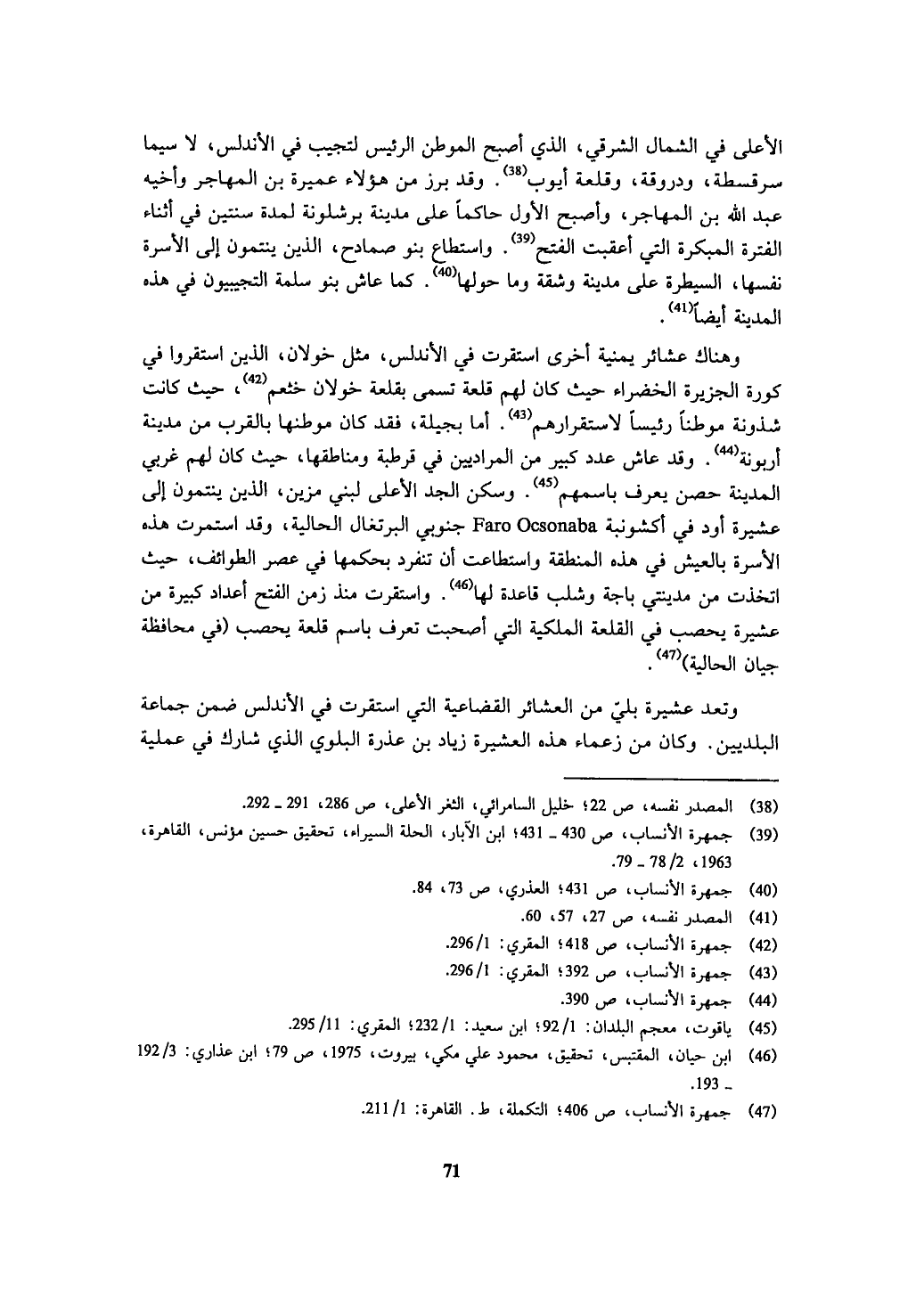 وهناك عشائر يمنية أخرى استقرت في الأندلس، مثل خولان، الذين استقروا في كورة الجزيرة الخضراء حيث كان لهم قلعة تسمى بقلعة خولان خثعم (¬42)، حيث كانت شذونة موطناً رئيساً لاستقرارهم (¬43). أما بجيلة، فقد كان موطنها بالقرب من مدينة أربونة (¬44). وقد عاش عدد كبير من المراديين في قرطبة ومناطقها، حيث كان لهم غربي المدينة حصن يعرف باسمهم (¬45). وسكن الجد الأعلى لبني مزين، الذين ينتمون إلى عشيرة أود في أكشونبة Faro Ocsonaba جنوبي البرتغال الحالية، وقد استمرت هذه الأسرة بالعيش في هذه المنطقة واستطاعت أن تنفرد بحكمها في عصر الطوائف، حيث اتخذت من مدينتي باجة وشلب قاعدة لها (¬46). واستقرت منذ زمن الفتح أعداد كبيرة من عشيرة يحصب في القلعة الملكية التي أصحبت تعرف باسم قلعة يحصب (في محافظة جيان الحالية) (¬47).