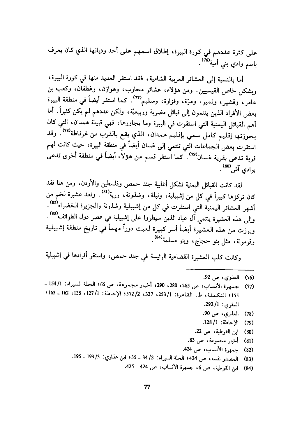 لقد كانت القبائل اليمنية تشكل أغلبية جند حمص وفلسطين والأردن، ومن هنا فقد كان تركزها كبيراً في كل من إشبيلية، ونبلة، وشذونة، ورية (¬81). وتعد عشيرة لخم من أشهر العشائر اليمنية التي استقرت في كل من إشبيلية وشذونة والجزيرة الخضراء (¬82). وإلى هذه العشيرة ينتمي آل عباد الذين سيطروا على إشبيلية في عصر دول الطوائف (¬83). وبرزت من هذه العشيرة أيضاً أسر كبيرة لعبت دوراً مهماً في تاريخ منطقة إشبيلية وقرمونة، مثل بنو حجاج، وبنو مسلمة (¬84).