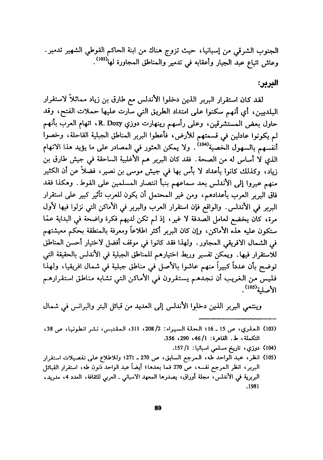 (¬105) انظر، عبد الواحد طه، المرجع السابق، ص 270 - 271؛ وللاطلاع على تفصيلات استقرار البربر، انظر المرجع نفسه، ص 270 فما بعدها؛ أيضاً عبد الواحد ذنون طه، استقرار القبائل البربرية في الأندلس، مجلة أوراق، يصدرها المعهد الاسباني - العربي للثقافة؛ العدد 4، مدريد، 1981.