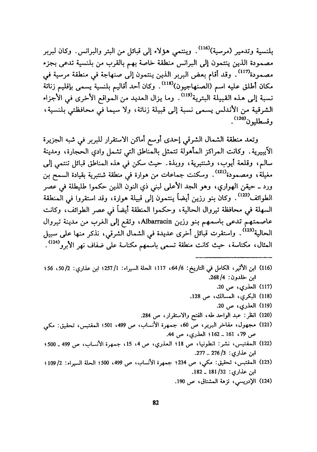 بلنسية وتدمير (مرسية) (¬116). وينتمي هؤلاء إلى قبائل من البتر والبرانس. وكان لبربر مصمودة الذين ينتمون إلى البرانس منطقة خاصة بهم بالقرب من بلنسية تدعى بجزء مصمودة (¬117). وقد أقام بعض البربر الذين ينتمون إلى صنهاجة في منطقة مرسية في مكان أطلق عليه اسم (الصنهاجيون) (¬118). وكان أحد أقاليم بلنسية يسمى بإقليم زناتة نسبة إلى هذه القبيلة البترية (¬119). وما يزال العديد من المواقع الأخرى في الأجزاء الشرقية من الأندلس يسمى نسبة إلى قبيلة زناتة، ولا سيما في محافظتي بلنسية، وقسطليون (¬120).