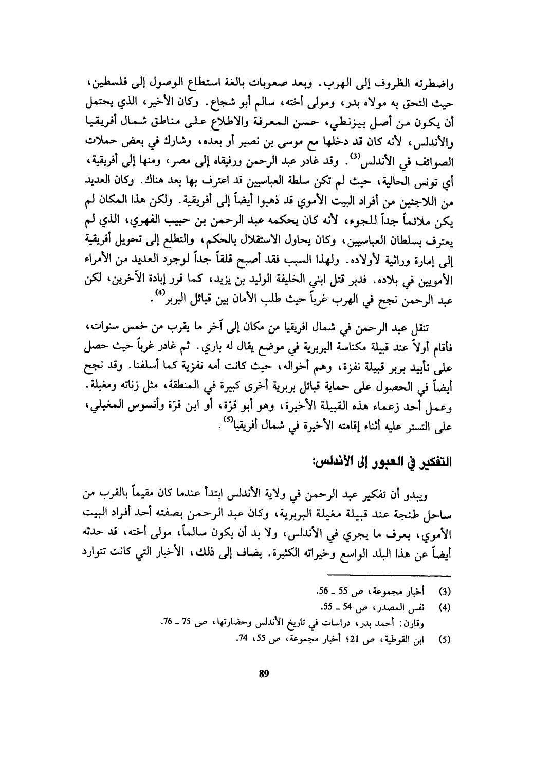 واضطرته الظروف إلى الهرب. وبعد صعوبات بالغة استطاع الوصول إلى فلسطين، حيث التحق به مولاه بدر، ومولى أخته، سالم أبو شجاع. وكان الأخير، الذي يحتمل أن يكون من أصل بيزنطي، حسن المعرفة والاطلاع على مناطق شمال أفريقيا والأندلس، لأنه كان قد دخلها مع موسى بن نصير أو بعده، وشارك في بعض حملات الصوائف في الأندلس (¬3). وقد غادر عبد الرحمن ورفيقاه إلى مصر، ومنها إلى أفريقية، أي تونس الحالية، حيث لم تكن سلطة العباسيين قد اعترف بها بعد هناك. وكان العديد من اللاجئين من أفراد البيت الأموي قد ذهبوا أيضاً إلى أفريقية. ولكن هذا المكان لم يكن ملائماً جداً للجوء، لأنه كان يحكمه عبد الرحمن بن حبيب الفهري، الذي لم يعترف بسلطان العباسيين، وكان يحاول الاستقلال بالحكم، والتطلع إلى تحويل أفريقية إلى إمارة وراثية لأولاده. ولهذا السبب فقد أصبح قلقاً جداً لوجود العديد من الأمراء الأمويين في بلاده. فدبر قتل ابني الخليفة الوليد بن يزيد، كما قرر إبادة الآخرين، لكن عبد الرحمن نجح في الهرب غرباً حيث طلب الأمان بين قبائل البربر (¬4).