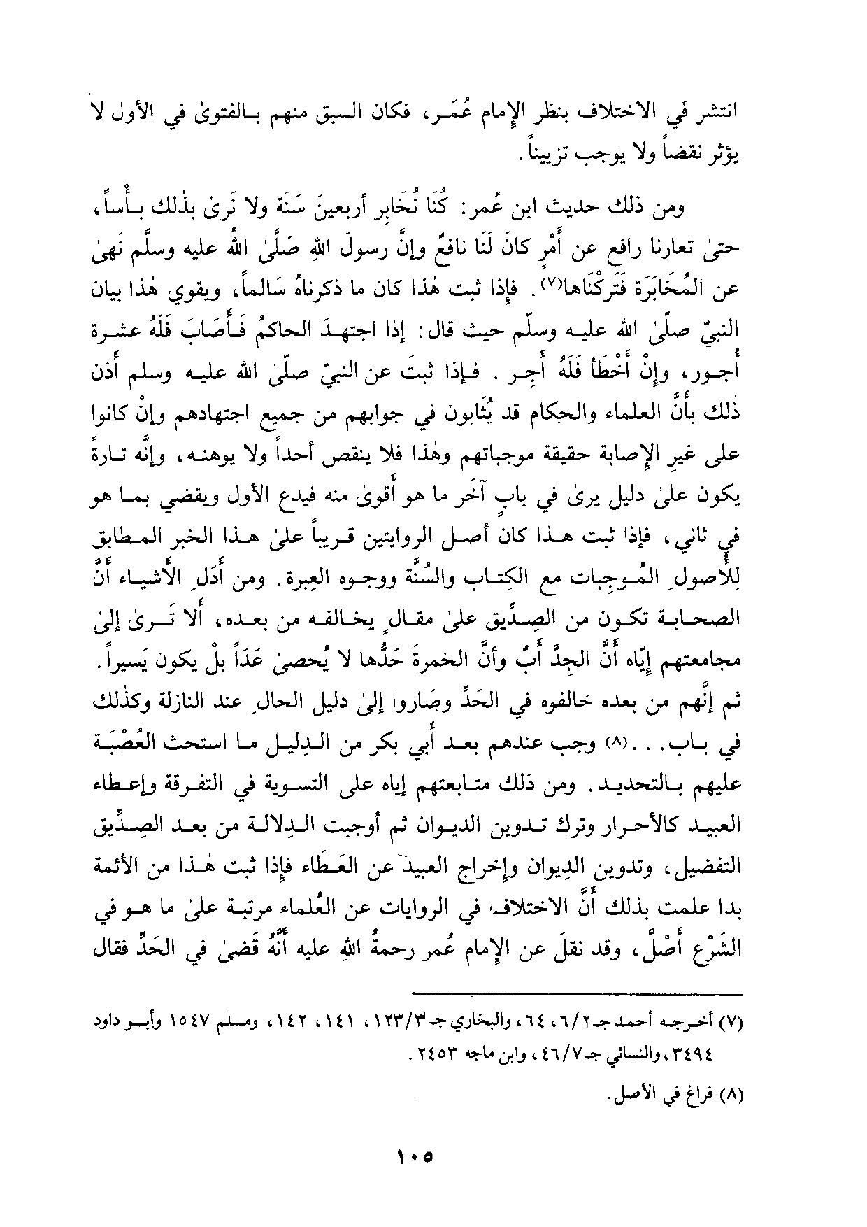 ثم إنهم من بعده خالفوه في الحد وصاروا إلى دليل الحال عند النازلة وكذلك في باب ... وجب عندهم بعد أبي بكر من الدليل ما استحث العصبة عليهم بالتحديد. ومن ذلك متابعتهم إياه على التسوية في التفرقة وإعطاء العبيد كالأحرار وترك تدوين الديوان ثم أوجبت الدلالة من بعد الصديق التفضيل، وتدوين الديوان وإخراج العبيد عن العطاء فإذا ثبت هذا من الأئمة بدا علمت بذلك أن الاختلاف في الروايات عن العلماء مرتبة على ما هو في الشرع أصل، وقد نقل عن الإمام عمر رحمة الله عليه أنه قضى في الحد فقال