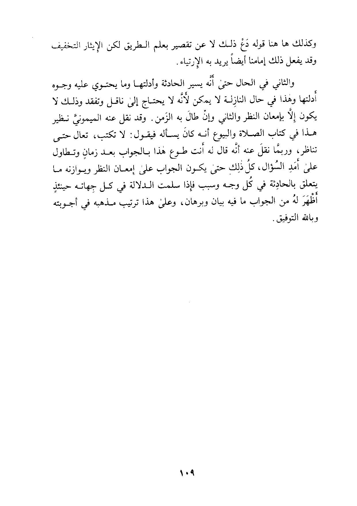 والثاني في الحال حتى أنه يسير الحادثة وأدلتها وما يحتوي عليه وجوه أدلتها وهذا في حال النازلة لا يمكن لأنه لا يحتاج إلى ناقل وتفقد وذلك لا يكون إلا بإمعان النظر والثاني وإن طال به الزمن. وقد نقل عنه الميموني نظير هذا في كتاب الصلاة والبيوع أنه كان يسأله فيقول: لا تكتب، تعال حتى تناظر، وربما نقل عنه أنه قال له أنت طوع هذا بالجواب بعد زمان وتطاول على أمد السؤال، كل ذلك حتى يكون الجواب على إمعان النظر ويوازنه ما يتعلق بالحادثة في كل وجه وسبب فإذا سلمت الدلالة في كل جهاته حينئذ أظهر له من الجواب ما فيه بيان وبرهان، وعلى هذا ترتيب مذهبه في أجوبته بالله التوفيق.