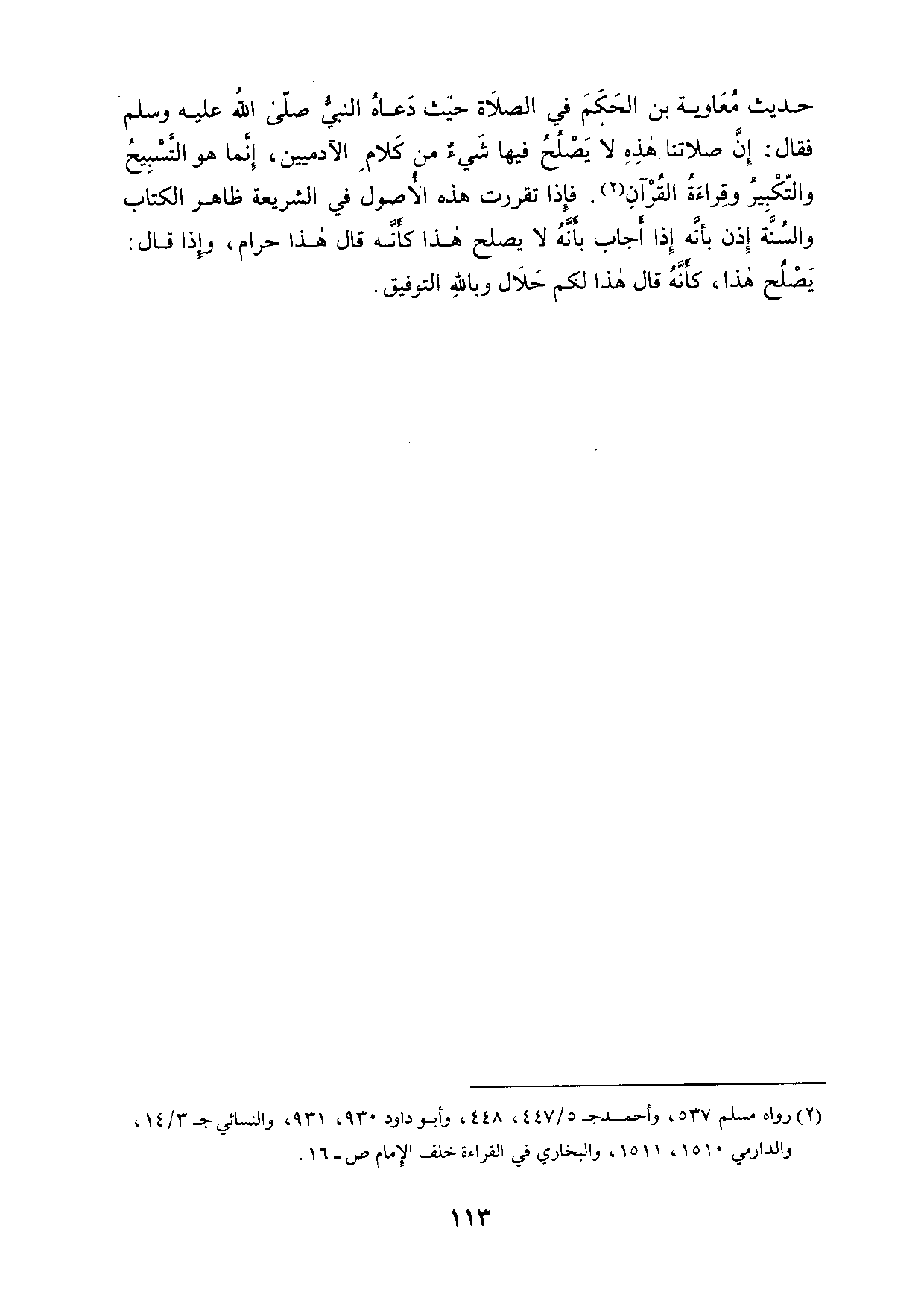 حديث معاوية بن الحكم في الصلاة حيث دعاه النبي صلى الله عليه وسلم فقال: إن صلاتنا هذه لا يصلح فيها شيء من كلام الآدميين، إنما هو التسبيح والتكبير وقراءة القرآن. فإذا تقررت هذه الأصول في الشريعة ظاهر الكتاب والسنة إذن بأنه إذا أجاب بأنه لا يصلح هذا كأنه قال هذا حرام، وإذا قال: يصلح هذا، كأنه قال هذا لكم حلال وبالله التوفيق.
