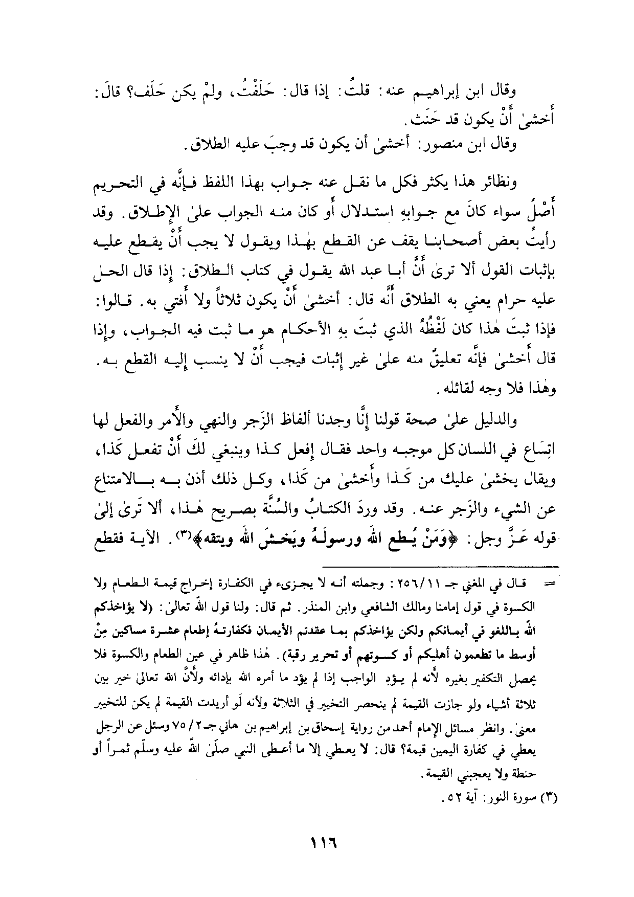 ونظائر هذا يكثر فكل ما نقل عنه جواب بهذا اللفظ فإنه في التحريم أصل سواء كان مع جوابه استدلال أو كان منه الجواب على الإطلاق. وقد رأيت بعض أصحابنا يقف عن القطع بهذا ويقول لا يجب أن يقطع عليه بإثبات القول ألا ترى أن أبا عبد الله يقول في كتاب الطلاق: إذا قال الحل عليه حرام يعني به الطلاق أنه قال: أخشى أن يكون ثلاثا ولا أفتي به. قالوا: فإذا ثبت هذا كان لفظه الذي ثبت به الأحكام هو ما ثبت فيه الجواب، وإذا قال أخشى فإنه تعليق منه على غير إثبات فيجب أن لا ينسب إليه القطع به. وهذا فلا وجه لقائله.