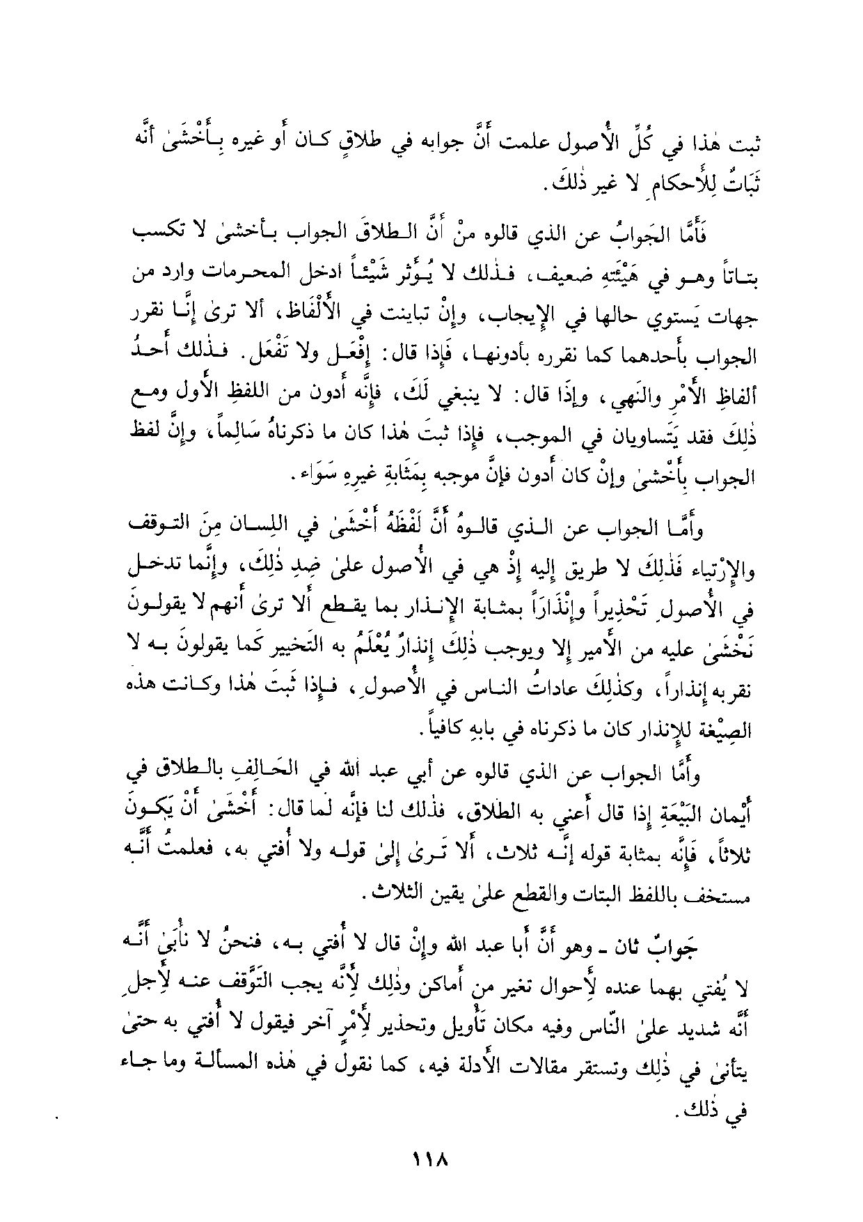 فأما الجواب عن الذي قالوه من أن الطلاق الجواب بأخشى لا تكسب بتاتا وهو في هيئته ضعيف، فذلك لا يؤثر شيئا ادخل المحرمات وارد من جهات يستوي حالها في الإيجاب، وإن تباينت في الألفاظ، ألا ترى إنا نقرر الجواب بأحدهما كما نقرره بأدونها، فإذا قال: إفعل ولا تفعل. فذلك أحد ألفاظ الأمر والنهي، وإذا قال: لا ينبغي لك، فإنه أدون من اللفظ الأول ومع ذلك فقد يتساويان في الموجب، فإذا ثبت هذا كان ما ذكرناه سالما، وإن لفظ الجواب بأخشى وإن كان أدون فإن موجبه بمثابة غيره سواء.
