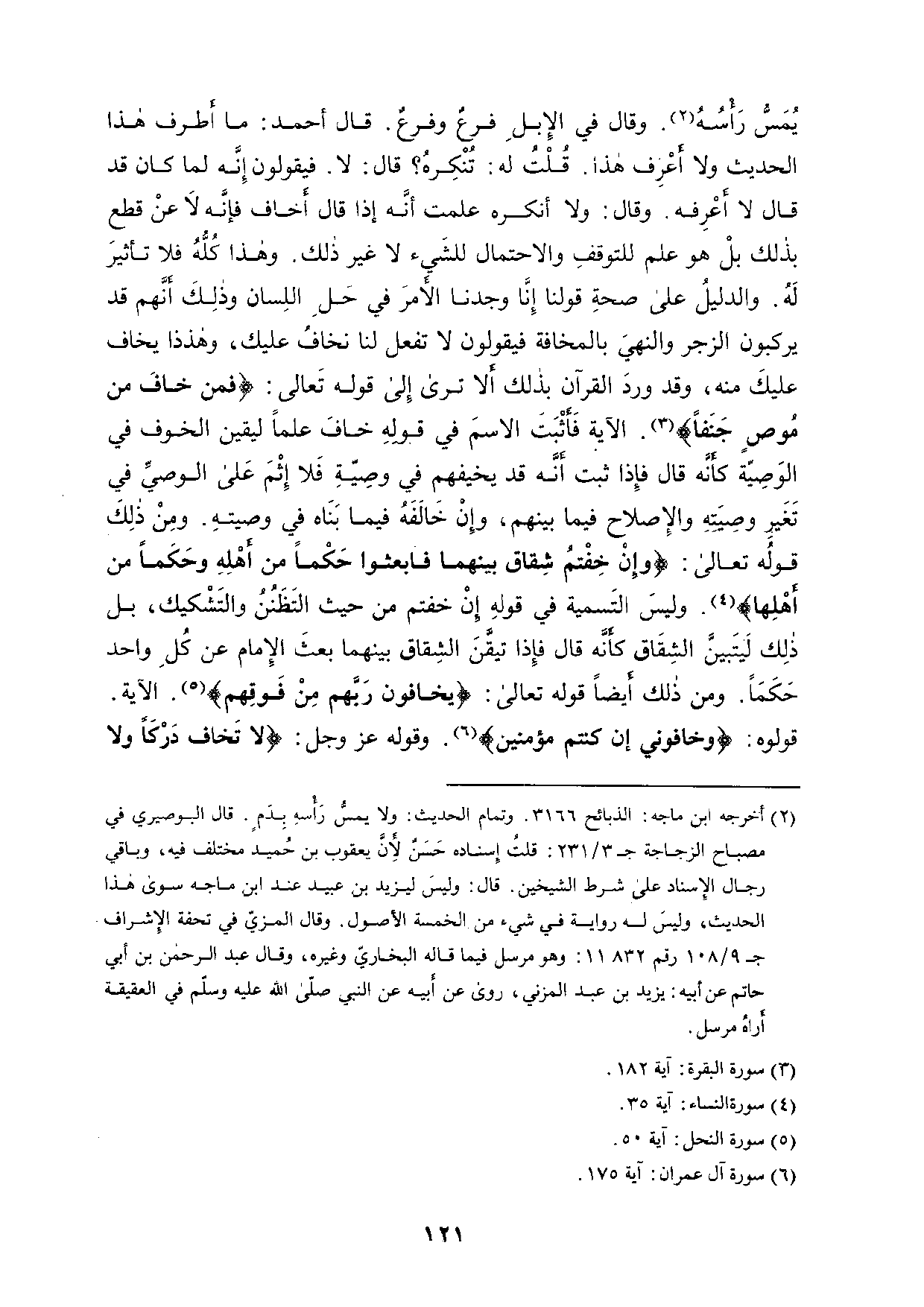 يمس رأسه. وقال في الإبل فرع وفرع. قال أحمد: ما أطرف هذا الحديث ولا أعرف هذا. قلت له: تنكره؟ قال: لا. فيقولون إنه لما كان قد قال لا أعرفه. وقال: ولا أنكره علمت أنه إذا قال أخاف فإنه لا عن قطع بذلك بل هو علم للتوقف والاحتمال للشيء لا غير ذلك. وهذا كله فلا تأثير له. والدليل على صحة قولنا إنا وجدنا الأمر في حل اللسان وذلك أنهم قد يركبون الزجر والنهي بالمخافة فيقولون لا تفعل لنا نخاف عليك، وهذا يخاف عليك منه، وقد ورد القرآن بذلك ألا ترى إلى قوله تعالى: {فمن خاف من موص جنفا}. الىية فأثبت الاسم في قوله خاف علما ليقين الخوف في الوصية كأنه قال فإذا ثبت أنه قد يخيفهم في وصية فلا إثم على الوصي في تغير وصيته والإصلاح فيما بينم، وإن خالفه فيما بناه في وصيته. ومن ذلك قوله تعالى: {وإن خفتم شقاق بينهما فابعثوا حكما من أهله وحكما من أهلها}. وليس التسمية في قوله إن خفتم من حيث التظن والتشكيك، بل ذلك ليتبين الشقاق كأن قال فإذا تيقن الشقاق بينهما بعث الإمام عن كل واحد حكما. ومن ذلك أيضا قوله تعالى: {يخافون ربهم من فوقهم}. الآية. قولوه: {وخافوني إن كنتم مؤمنين}. وقوله عز وجل: {لا تخاف دركا ولا
