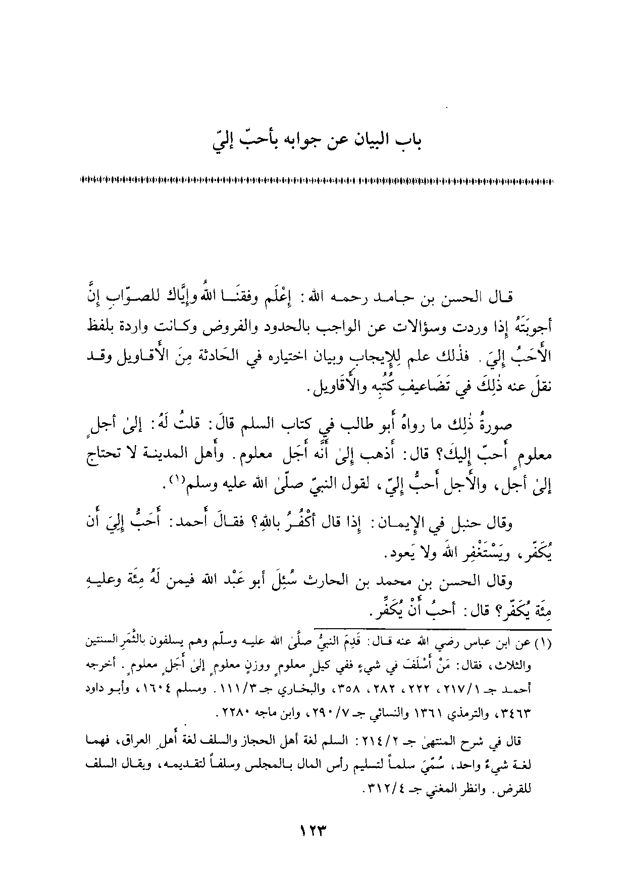 قال الحسن بن حامد رحمه الله: إعلم وفقنا الله وإياك للصواب إن أجوبته إذا وردت وسؤالات عن الواجب بالحدود والفروض وكانت واردة بلفظ الأحب إلي. فذلك علم للإيجاب وبيان اختياره في الحادثة من الأقاويل وقد نقل عنه ذلك في تضاعيف كتبه والأقاويل.