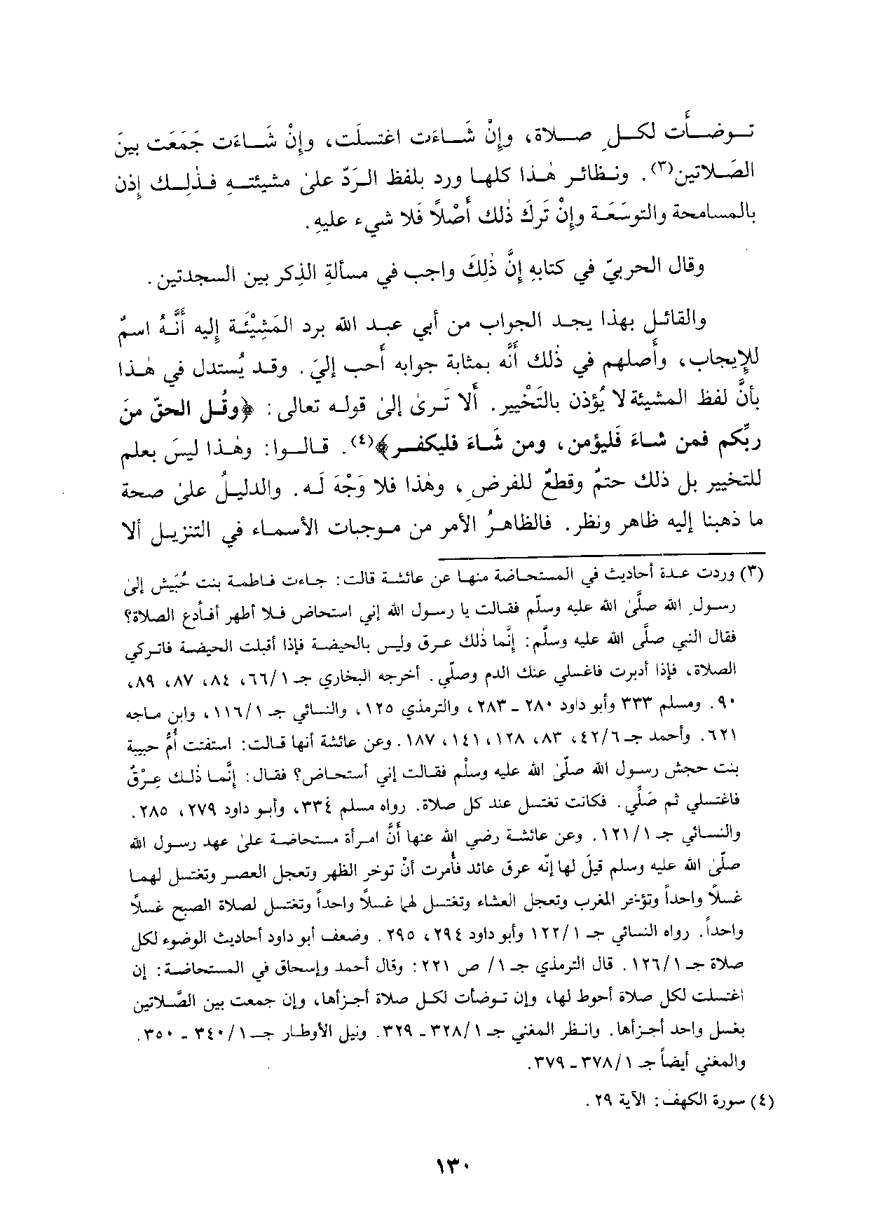 توضأت لكل صلاة، وإن شاءت اغتسلت، وإن شاءت جمعت بين الصلاتين. ونظائر هذا كلها ورد بلفظ الرد على مشيئته فذلك إذن بالمسامحة والتوسعة وإن ترك ذلك أصلا فلا شيء عليه.