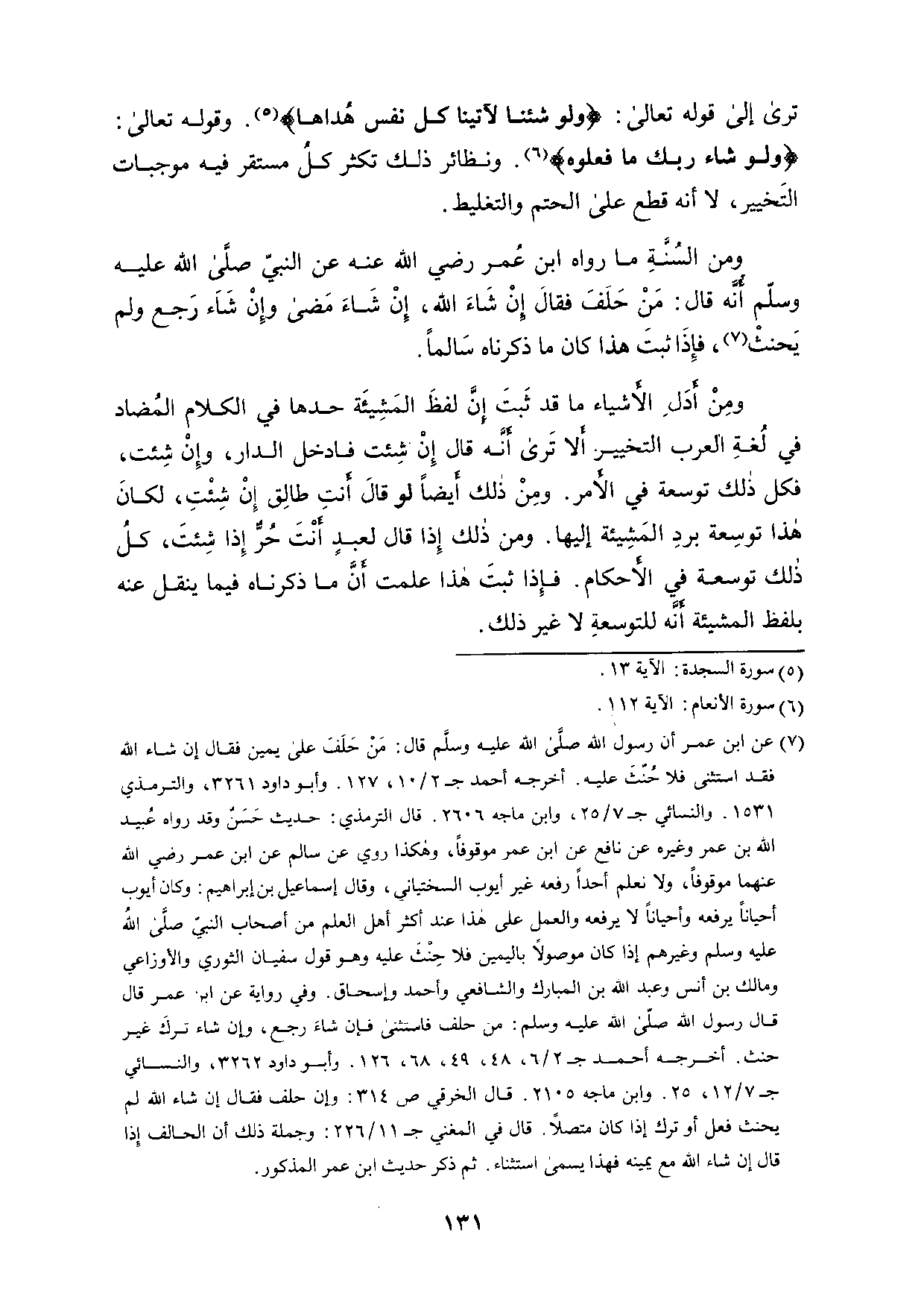 ومن السنة ما رواه ابن عمر رضي الله عنه عن النبي صلى الله عليه وسلم أنه قال: من حلف فقال إن شاء الله، إن شاء مضى وإن شاء رجع ولم يحنث، فإذا ثبت هذا كان ما ذكرناه سالما.
