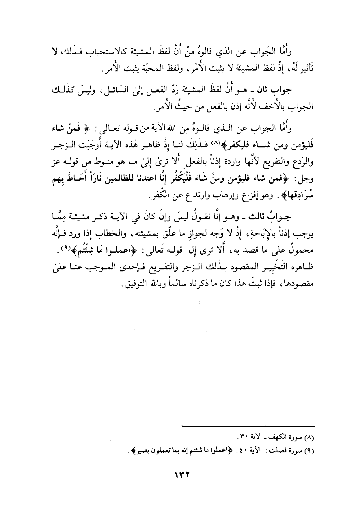 وأما الجواب عن الذي قالوه من الله الآية من قوله تعالى: {فمن شاء فليؤمن ومن شاء فليكفر} فذلك لنا إذ ظاهر هذه الآية أوجبت الزجر والردع والتفريع لأنها واردة إذنا بالفعل ألا ترى إلى ما هو منوط من قوله عز وجل: {فمن شاء فليؤمن ومن شاء فليكفر إنا اعتدنا للظالمين نارا أحاط بهم سرادقها}. وهو إفزاع وإرهاب وارتداه عن الكفر.