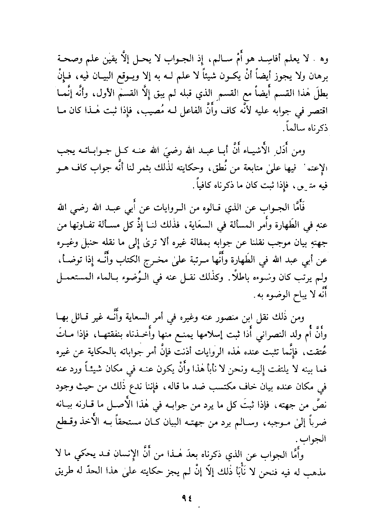 وأما الجواب عن الذي ذكرناه بعد هذا من أن الإنسان قد يحكي ما لا مذهب له فيه فنحن لا نأبأ ذلك إلا إن لم يجز حكايته على هذا الحد له طريق