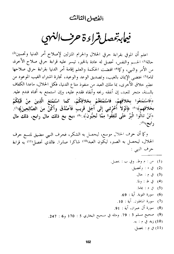وكما أن حرف الحلال موسع، ليحصل به الشكر، فحرف النهي مضيق لمتسع حرف الحلال، ليحصل به الصبر، ليكون العبد شاكرا صابرا. فالذي تحصل به قراءة حرف النهي: