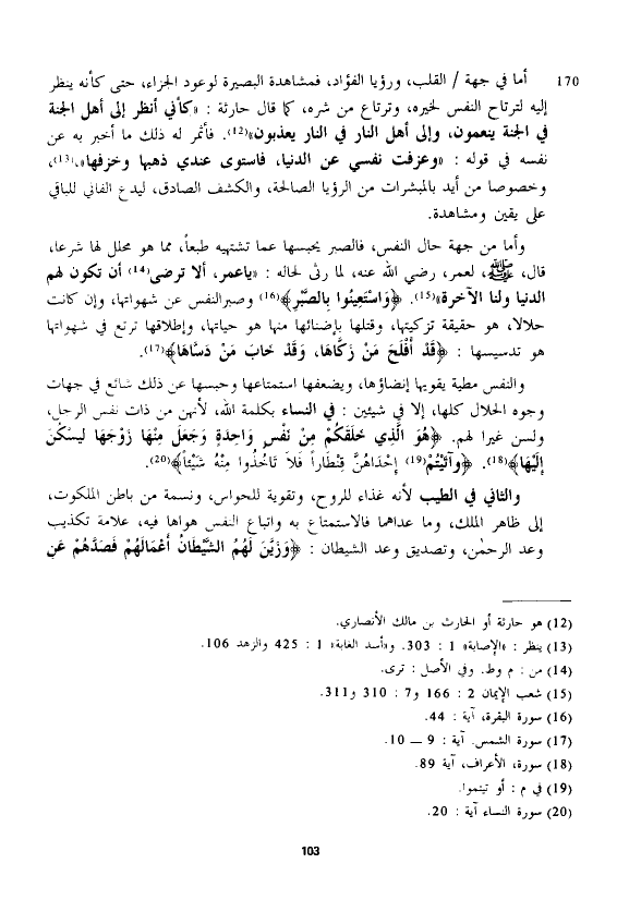 أما في جهة القلب، ورؤيا الفؤاد، فمشاهدة البصيرة لوعود الجزاء، حتى كأنه ينظر إليه لترتاح النفس لخيره، وترتاع من شره، كما قال حارثة: "كأني أنظر إلى أهل الجنة في الجنة ينعمون، وإلى أهل النار في النار يعذبون". فأثمر له ذلك ما أخبر به عن نفسه في قوله: "وعزفت نفسي عن الدنيا، فاستوى عندي ذهبها وخزفها"، وخصوصا من أيد بالمبشرات من الرويا الصالحة، والكشف الصادق، ليدع الفاني للباقي على يقين ومشاهدة.