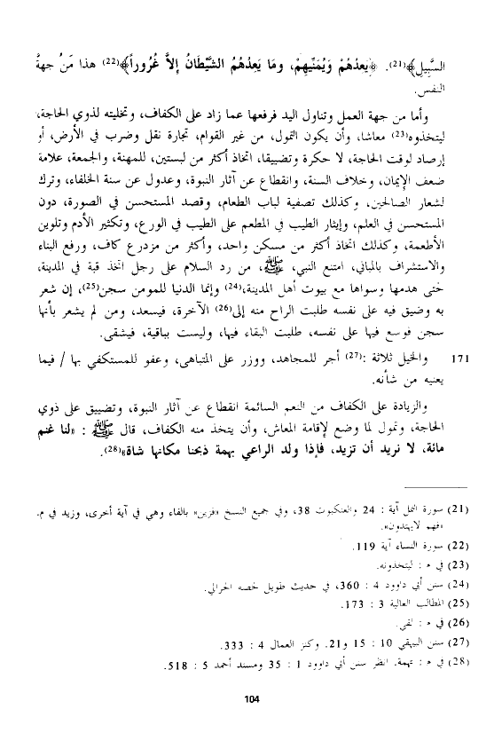 والزيادة على الكفاف من النعم السائدة انقطاع عن آثار النبوة، وتضييق على ذوي الحاجة، وتمول لما وضع لإقامة المعاش، وإن يتخذ منه الكفاف، قال - صلى الله عليه وسلم -: "لنا غنم مائة، لا نريد أن تزيد، فإذا ولد الراعي بهمة ذبحنا مكانها شاة".