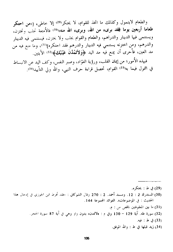 والطعام لايتمول وكذلك ما اتخذ للقوام، لا يحتكر إلا خاطىء ["من احتكر طعاما أربعين يوما فقد برئ من الله، وبوئ الله منه" فالأمتعة تجلب وتختزن، ويستنمى فيها الدينار والدراهم، والطعام والقوام يجلب ولا يختزن، فيستنمى فيه الدينار والدرهم، ومن اختزنه يستنمي فيه الدينار والدرهم فقد احتكره]، وما منع فيه من مد العين، فأحرى أن يمنع فيه مد اليد {وَلَا تَمُدَّنَّ عَيْنَيْكَ} الآيتين.