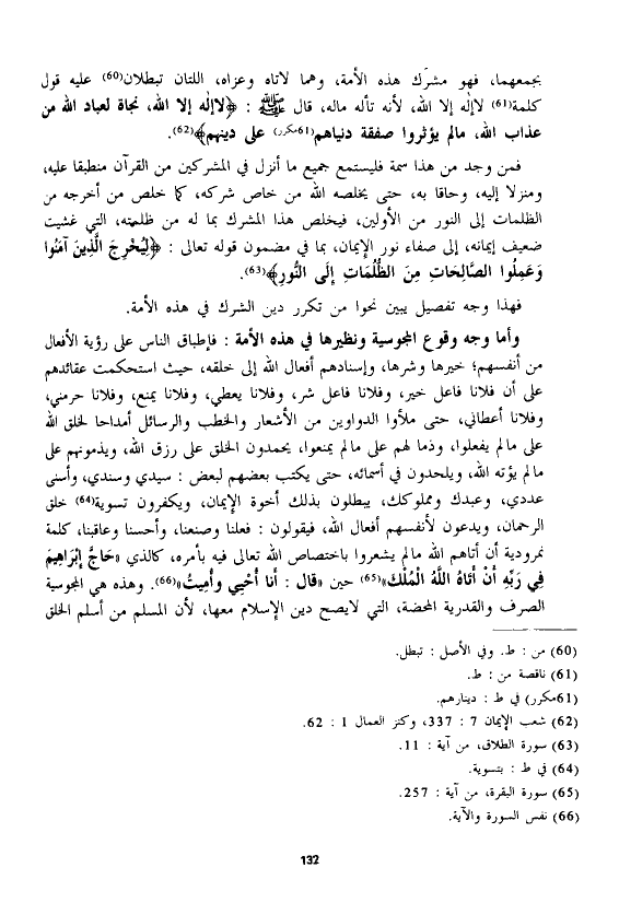 وأما وجه وقوع المجوسية ونظيرها في هذه الأمة: فإطباق الناس على رؤية الأفعال من أنفسهم؛ خيرها وشرها، وإسنادهم أفعال الله إلى خلقه، حيث استحكمت عقائدهم على أن فلانا فاعل خير، وفلانا فاعل شر، وفلانا يعطي، وفلانا يمنع، وفلانا حرمني، وفلانا أعطاني، حتى ملأوا الدواوين من الأشعار والخطب والرسائل أمداحا لخلق الله على ما لم يفعلوا، وذما لهم على ما لم يمنعون، يحمدون الخلق على رزق الله، ويذمونهم على ما لم يؤته الله، ويلحدون في أسمائه، حتى يكتب بعضهم لبعض: سيدي وسندي، وأسنى عددي، وعبدك ومملوكك، يبطلون بذلك أخوة الإيمان، ويكفرون تسوية خلق الرحمان، ويدعون لأنفسهم أفعال الله، فيقولون: فعلنا وصنعنا، وأحسنا وعاقبنا، كلمة نمرودية أن أتاهم الله ما لم يشعروا باختصاص الله تعالى فيه بأمره، كالذي "حاج إبراهيم في ربه أن أتاه الله الملك" حين "قال: أنا أحيي وأميت". وهذه هي المجوسية الصرف والقدرية المحضة، التي لايصح دين الإسلام معها، لأن المسلم من أسلم الخلق