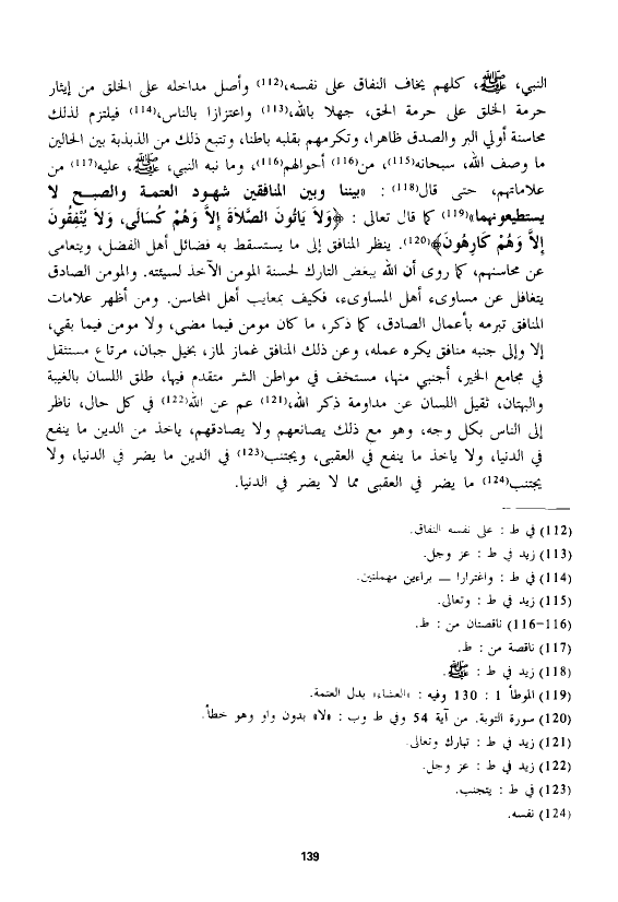 النبي، - صلى الله عليه وسلم -، كلهم يخاف النفاق على نفسه، وأصل مداخله على الخلق من إيثار حرمة الخلق على حرمة الحق، جهلا بالله، واعتزارا بالناس، فيلتزم لذلك محاسنة أولي البر والصدق ظاهرا، وتكرمهم بقلبه باطنا، وتتبع ذلك من الذبذبة بين الحالين ما وصفه الله، سبحانه، من أحوالهم، وما نبه النبي، - صلى الله عليه وسلم -، عليه من علاماتهم، حتى قال: "بيننا وبين المنافقين شهود العتمة والصبح لا يستطيعونهما" كما قال تعالى: {وَلَا يَأْتُونَ الصَّلَاةَ إِلَّا وَهُمْ كُسَالَى وَلَا يُنْفِقُونَ إِلَّا وَهُمْ كَارِهُونَ}. ينظر المنافق إلى ما يستسقط به فضائل أهل الفضل، ويتعامى عن محاسنهم، كما روى أن الله يبغض التارك لحسنة المؤمن الآخر لسيئته. والمؤمن الصادق يتغافل عن مساوئ أهل المساوئ، فكيف بمعايب أهل المحاسن. ومن أظهر علامات المنافق تبرمه بأعمال الصادق، كما ذكر، ما كان مؤمن فيما مضى، ولا مؤمن فيما بقي، إلا وإلى جنبه منافق يكره عمله، وعن ذلك المنافق غماز لماز، بخيل جبان، مرتاع مستثقل في مجامع الخير، أجنبي منها، مستخف في مواطن الشر متقدم فيها، طلق اللسان بالغيبة والبهتان، ثقيل اللسان عن مداومة ذكر الله، عم عن الله في كل حال، ناظر إلى الناس بكل وجه، وهو مع ذلك يصانعهم ولا يصادقهم، ياخذ من الدين ما ينفع في الدنيا، ولا ياخذ ما ينفع في العقبى، ويجتنب في الدين ما يضر في الدنيا، ولا يجتنب ما يضر في العقبى مما يضر في الدنيا.