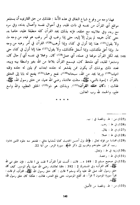 فهذا وجه من وقوع شياع النفاق في هذه الأمة: فلذلك من حق القارئ أن يستشعر مواقع آي القرآن من نفسه في ذات قلبه، وفي أحوال نفسه وأعمال بدنه، وفي سره مع ربه، وفي علانيته مع خلقه، فإنه بذلك يجد القرآن كله منطبقا عليه، خاصا به، حتى كأن جميعه لم ينزل إلا إليه، حتى إذا رغب في أمر رغب هو فيه، من وجه ما، ولا يقول هذا إنما أنزل في كذا، وإذا أرهب القرآن في أمر رهبه من وجه ما. وإذا أعلى فكذلك، وإذا أسفل فكذلك، ولا يقول هذا إنما أنزل في كذا، حتى يجد لكل القرآن موقعا في عمله، أي عمل كان. ومحلا في نفسه أي حال كان، ومشعرا لقلبه، أي ملحظ كان، فيسمع القرآن بلاغا من الله بغير واسطة بينه وبينه، فعند ذلك يوشك أن يكون ممن يقشعر له جلده ابتداء، ثم يلين له جلده وقلبه انتهاء، وربما يجد من الله، سبحانه، نفح رحمة، يفتح له بابا إلى التخلق بالقرآن؛ إسوة بالنبي، - صلى الله عليه وسلم -، سئلت عائشة، - رضي الله عنها -، عن خلق رسول الله، - صلى الله عليه وسلم -، فقالت: "كان خلقه القرآن". وبذلك هو ذو الخلق العظيم، والله واسع عليم، والحمد لله رب العالمين.