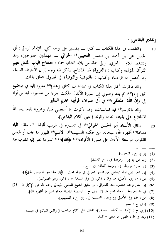 وانتفعت في هذا الكتاب - كثيرا - بتفسير على وجه كلي، للإمام الرباني: أبي الحسن علي بن أحمد بن الحسن التجيبي الْحَرَالِّي - بمهملتين مفتوحتين، ومد وتشديد اللام - المغربي، نزيل حماة من بلاد الشام، سماه: "مفتاح الباب المقفل لفهم القرآن المنزل" وكتاب: "العروة" لهذا المفتاح، يذكر فيه وجه إنزال الأحرف السبعة، وما تحصل به قراءتها، وكتاب: "التوشية والتوفية" في فصول تتعلق بذلك.
