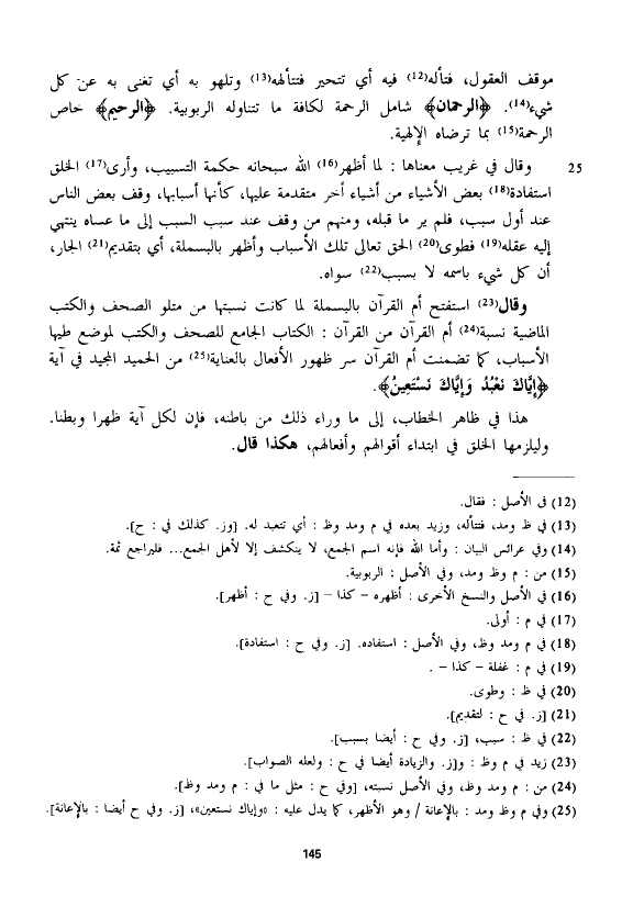 وقال استفتح أم القرآن بالبسملة لما كانت نسبتها من متلو الصحف والكتب الماضية نسبة أم القرآن من القرآن: الكتاب الجامع للصحف والكتب لموضع طيها الأسباب، كما تضمنت أم القرآن سر ظهور الأفعال بالعناية من الحميد المجيد في آية {إِيَّاكَ نَعْبُدُ وَإِيَّاكَ نَسْتَعِينُ}.