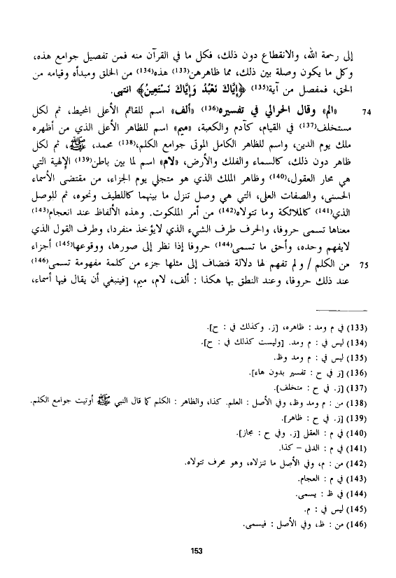 وقال الْحَرَالِّي في تفسيره "ألف" اسم للقائم الأعلى المحيط، ثم لكل مستحلف في القيام، كآدم والكعبة، "ميم" اسم للظاهر الأعلى الذي من أظهره ملك يوم الدين، واسم للظاهر الكامل الموتى جوامع الكلم، محمد، - صلى الله عليه وسلم -، ثم لكل ظاهر دون ذلك، كالسماء والفلك والأرض، "لام" اسم لما بين باطن الإلهية التي هي محار العقول، وظاهر الملك الذي هو متجلي يوم الجزاء، من مقتضى الأسماء الحسنى، والصفات العلى، التي هي وصل تنزل ما بينهما كاللطيف ونحوه، ثم للوصل الذي كالملائكة وما تتولاه من أمر الملكوت. وهذه الألفاظ عند انعجام معناها تسمى حروفا، والحرف طرف الشيء الذي لا يؤخد منفردا، وطرف القول الذي لا يفهم وحده، وأحق ما تسمى حروفا إذا نظر إلى صورها، ووقوعها أجزاء من الكلم ولم تفهم لها دلالة فتضاف إلى مثلها جزء من كلمة مفهومة تسمى عند ذلك حروفا، وعند النطق بها هكذا: ألف، لام، ميم، [فينبغي أن يقال فيها أسماء،