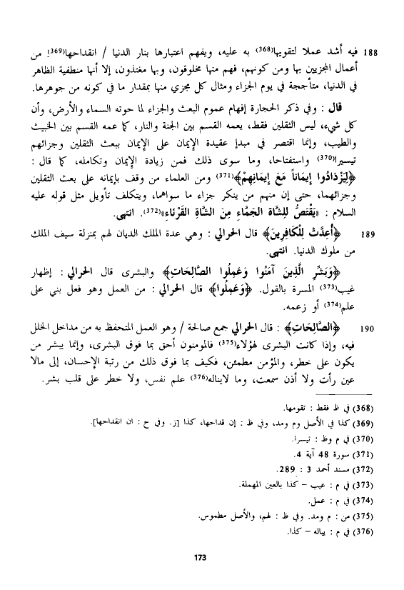 قال: وفي ذكر الحجارة إفهام عموم البعث والجزاء لما حوته السماء والأرض، وأن كل شيء، ليس الثقلين فقط، يعمه القسم بين الجنة والنار، كما عمه القسم بين الخبيث والطيب، وإنما اقتصر في مبدأ عقيدة الإيمان على الإيمان ببعث الثقلين وجزائهم تيسيراً واستفتاحا، وما سوى ذلك فمن زيادة الإيمان وتكامله، كما قال: {لِيَزْدَادُوا إِيمَانًا مَعَ إِيمَانِهِمْ} ومن العلماء من وقف بإيمانه على بعث الثقلين وجزائهما، حتى إن منهم من ينكر جزاء ما سواهما، ويتكلف تأويل مثل قوله عليه السلام: "يقتص للشاة الجماء من الشاة القرناء". انتهى.