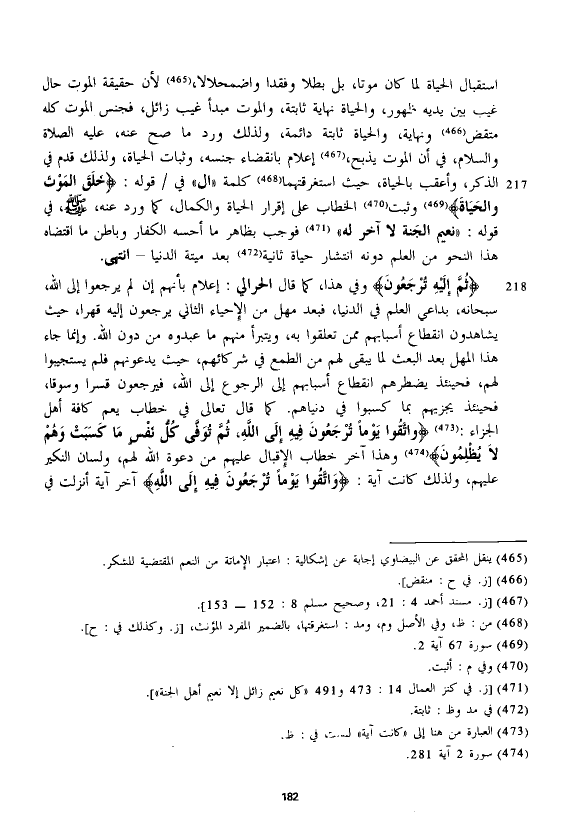 استقبال الحياة لما كان موتا، بل بطلا وفقدا واضمحلالا، لأن حقيقة الموت حال غيب بين يديه ظهور، والحياة نهاية ثابتة، والموت مبدأ غيب زائل، فجنس الموت كله متقض ونهاية، والحياة ثابتة دائمة، ولذلك ورد ما صح عنه، عليه الصلاة والسلام، في أن الموت يذبح، إعلام بانقضاء جنسه، وثبات الحياة، ولذلك قدم في الذكر، وأعقب بالحياة، حيث استغرقتهما كلمة "ال" في قوله: {خَلَقَ الْمَوْتَ وَالْحَيَاةَ} وثبت الخطاب على إقرار الحياة والكمال، كما ورد عنه، - صلى الله عليه وسلم -، في قوله: "نعيم الجنة لا آخر له" فوجب بظاهر ما أحسه الكفار وباطن ما أقتضاه هذا النحو من العلم دونه انتشار حياة ثانية بعد ميتة الدنيا - انتهى.