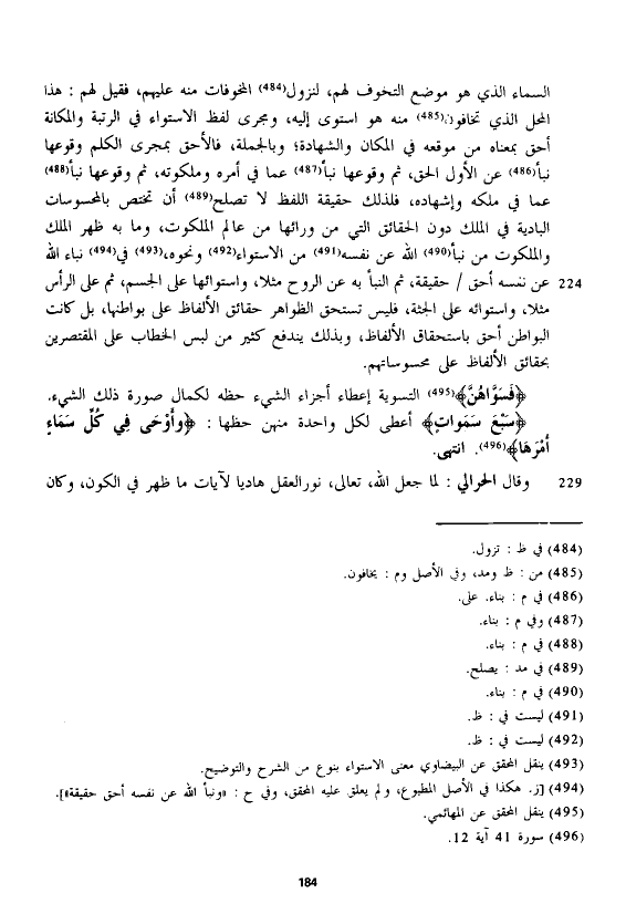 السماء الذي هو موضع التخوف لهم، لنزول المخوفات منه عليهم، فقيل لهم: هذا المحل الذي تخافون منه هو استوى إليه، ومجرى لفظ الاستواء في الرتبة والمكانة أحق بمعناه من موقعه في المكان والشهادة؛ وبالجملة، فالأحق بمجرى الكلم وقوعها نبأ عن الأول الحق، ثم وقوعها نبأ عما في أمره وملكوته، ثم وقوعها نبأ عما في ملكه وإشهاده، فلذلك حقيقة اللفظ لا تصلح أن تختص بالمحسوسات البادية في الملك دون الحقائق التي من ورائها من عالم الملكوت، وما به ظهر الملك والملكلوت من نبأ الله عن نفسه من الاستواء ونحوه، في نباء الله عن نفسه أحق حقيقة، ثم النبأ به عن الروح مثلا، واستوائها على الجسم، ثم على الرأس مثلا، واستوائه على الجثة، فليس تستحق الظواهر حقائق الألفاظ على بواطنها، بل كانت البواطن أحق باستحقاق الألفاظ، وبذلك يندفع كثير من لبس الخطاب على المقتصرين بحقائق الألفاظ على محسوساتهم.