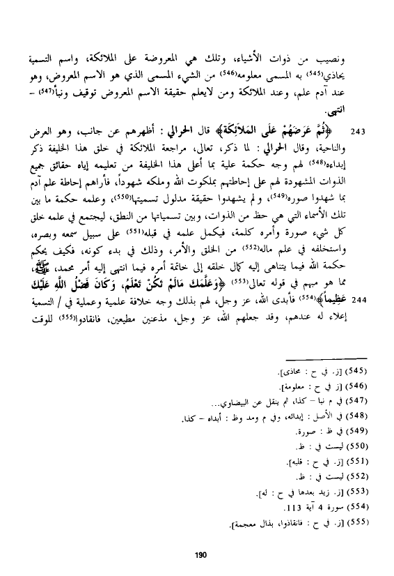 ونصيب من ذوات الأشياء، وتلك هي المعروضة على الملائكة، واسم التسمية يحاذي به المسمى معلومه من الشيء المسمى الذي هو الاسم المعروض، وهو عند آدم علم، وعند الملائكة ومن لايعلم حقيقة الاسم المعروض توقيف ونبأ - انتهى.