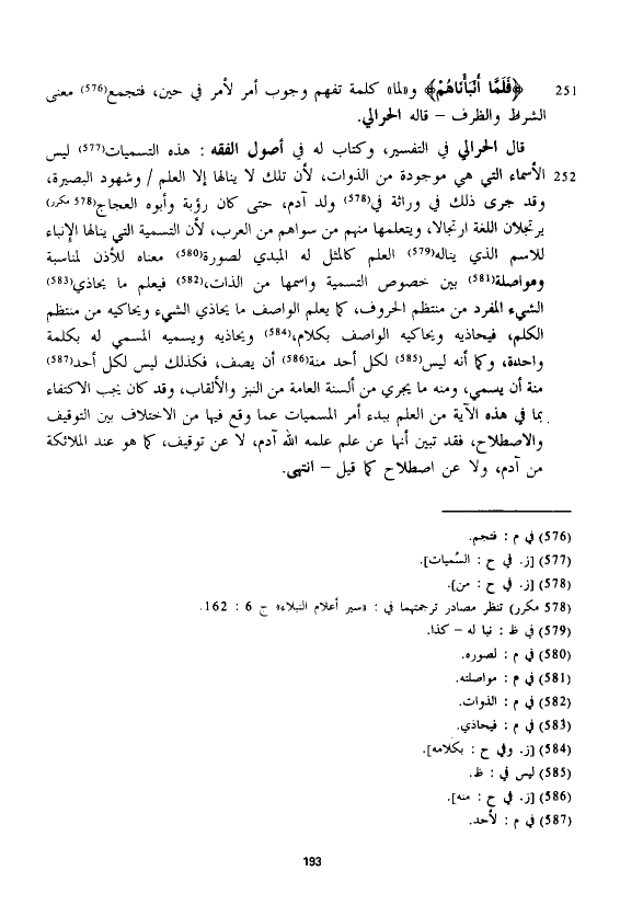 قال الْحَرَالِّي في التفسير، وكتاب له في أصول الفقه: هذه التسميات ليس الأسماء التي هي موجودة من الذوات، لأن تلك لا ينالها إلا العلم وشهود البصيرة، وقد جرى ذلك في وراثة في ولد آدم، حتى كان رؤبة وأبوه العجاج يرتجلان اللغة ارتجالا، ويتعلمها منهم من سواهم من العرب، لأن التسمية التي ينالها الإنباء للاسم الذي يناله العلم كالمثل له المبدي لصورة معناه للأذن لمناسبة ومواصلة بين خصوص التسمية واسمها من الذات، فيعلم ما يحاذي الشيء المفرد من منتظم الحروف، كما يعلم الواصف ما يحاذي الشيء ويحاكيه من منتظم الكلم، فيحاذيه ويحاكيه الواصف بكلام، ويحاذيه ويسميه المسمى له بكلمة واحدة، وكما أنه ليس لكل أحد منة أن يصف، فكذلك ليس لكل أحد منة أن يسمى، ومنه ما يجري من ألسنة العامة من النبز والألقاب، وقد كان يجب الاكتفاء بما في هذه الآية من العلم ببدء أمر المسميات عما وقع فيها من الاختلاف بين التوقيف والاصطلاح، فقد تبين أنها عن علم علمه الله آدم، لا عن توقيف، كما هو عند الملائكة من آدم، ولا عن اصطلاح كما قيل - انتهى.