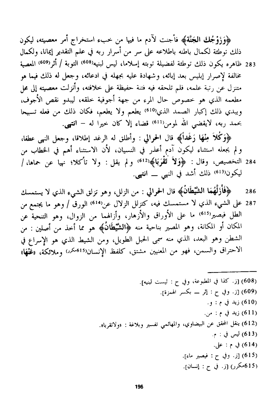 {وَزَوْجُكَ الْجَنَّةَ} فأجنت لآدم ما فيها من خبء استخراج أمر معصيته، ليكون ذلك توطئة لكمال باطنه باطلاعه على سر من أسرار ربه في علم التقدير إيمانا، ولكمال ظاهره يكون ذلك توطئة لفضيلة توبته إسلاما، ليس لبنيه التوبة أثر المعصية مخالفة لإصرار إبليس بعد إبائه، وشهادة عليه بجهله في ادعائه، وجعل له ذلك فيما هو متنزل عن رتبة علمه، فلم تلحقه فيه فتنة حفيظة على خلافته، وأنزلت معصيته إلى محل مطعمه الذي هو خصوص حال المرء من جهة أجوفية خلقه، ليبدو نقص الأجوف، ويبدي ذلك إكبار الصمد الذي يطعم ولا يطعم، فكان ذلك من فعله تسبيحا بحمد ربه، لا يقضي الله لمؤمن قضاء إلا كان خيرا له - انتهى.