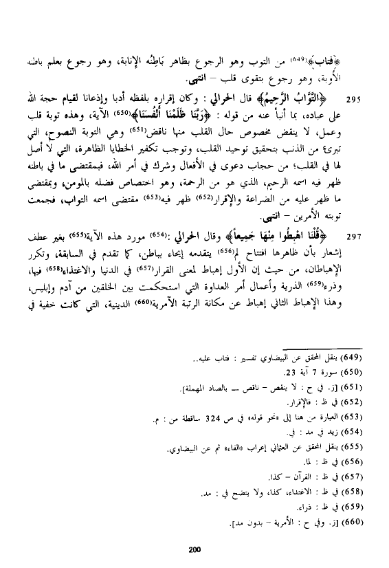 قال الْحَرَالِّي: وكان إقراره بلفظه أدبا وإذعانا لقيام حجة الله على عباده، بما أنبأ عنه من قوله: {رَبَّنَا ظَلَمْنَا أَنْفُسَنَا} الآية، وهذه توبة قلب وعمل، لا ينقض مخصوص حال القلب منها ناقض وهي التوبة النصوح، التي تبرئ من الذنب بتحقيق توحيد القلب، وتوجب تكفير الخطايا الظاهرة، التي لا أصل لها في القلب؛ من حجاب دعوى في الأفعال وشرك في أمر الله، فبمقتضى ما في باطنه ظهر فيه اسمه الرحيم، الذي هو من الرحمة، وهو اختصاص فضله بالمؤمن، وبمقتضى ما ظهر عليه من الضراعة والإقرار ظهر فيه مقتضى اسمه التواب، فجمعت توبته الأمرين - انتهى.