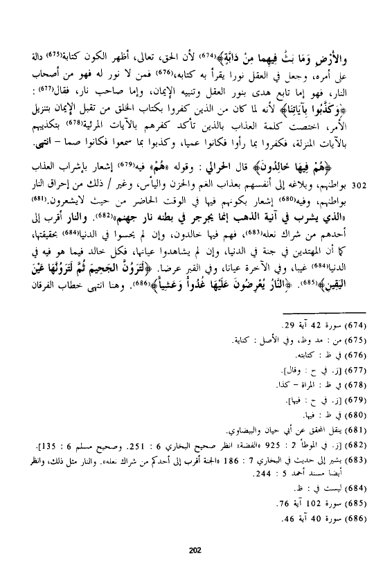قال الْحَرَالِّي: وقوله "هُمْ" فيه إشعار بإشراب العذاب بواطنهم، وبلاغه إلى أنفسهم بعذاب الغم والحزن واليأس، وغير ذلك من إحراق النار بواطنهم، وفيه إشعار بكونهم فيها في الوقت الحاضر من حيث لا يشعرون. "الذي يشرب في آنية الذهب إنما يجرجر في بطنه نار جهنم". والنار أقرب إلى أحدهم من شراك نعله، فهم فيها خالدون، وإن لم يحسوا في الدنيا بحقيقتها، كما أن المهتدين في جنة في الدنيا، وإن لم يشاهدوا عيانها، فكل خالد فيما هو فيه في الدنيا غيبا، وفي الآخرة عيانا، وفي القبر عرضا. {لترون لَتَرَوُنَّ الْجَحِيمَ (6) ثُمَّ لَتَرَوُنَّهَا عَيْنَ الْيَقِينِ}. {النَّارُ يُعْرَضُونَ عَلَيْهَا غُدُوًّا وَعَشِيًّا}. وهنا انتهى خطاب الفرقان