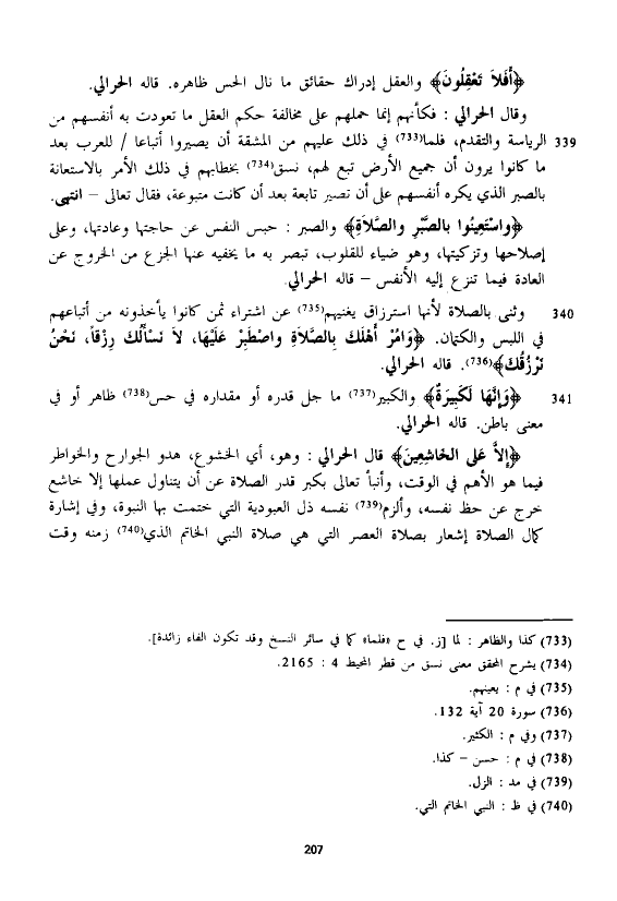 {وَاسْتَعِينُوا بِالصَّبْرِ وَالصَّلَاةِ} والصبر: حبس النفس عن حاجتها وعادتها، وعلى إصلاحها وتزكيتها، وهو ضياء للقلوب، تبصر به ما يخفيه عنها الجزع من الخروج عن العادة فيما تنزع إليه الأنفس - قاله الْحَرَالِّي.
